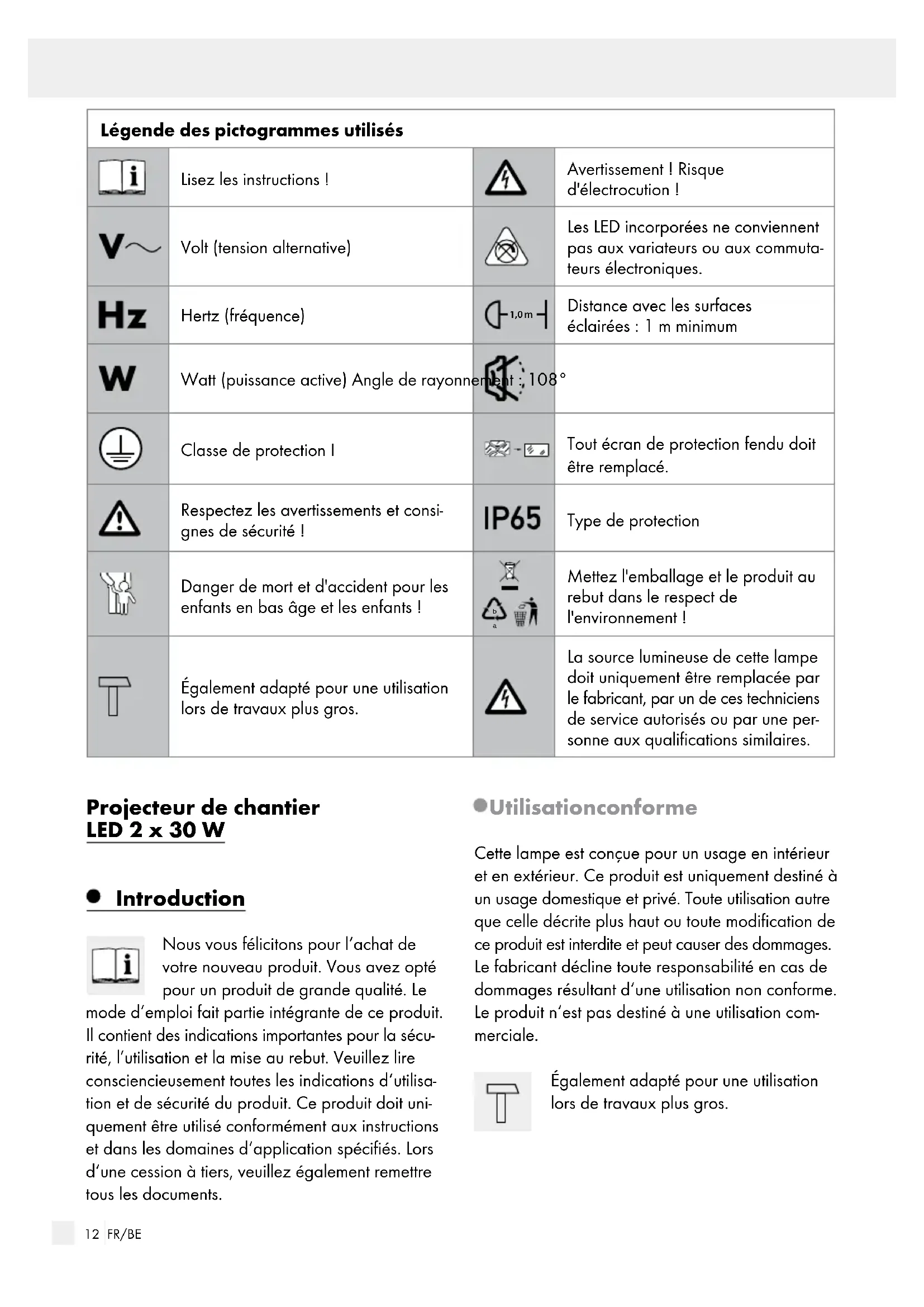 - Kostenfreie Nummer IAN 302797 Bitte halten Sie für alle Anfragen den Kassenbon und die Artikelnummer (IAN 302797) als Nachweis für den Kauf bereit.11 FR/BE Légende des pictogrammes utilisés ..........................................................................Page 12 Introduction ................................................................................................................................... Page 12 Utilisation conforme ............................................................................................................................Page 12 Contenu de la livraison .......................................................................................................................Page 13 Descriptif des pièces ...........................................................................................................................Page 13 Caractéristiques techniques ................................................................................................................Page 13 Consignes de sécurité ...........................................................................................................Page 13 Montage ...........................................................................................................................................Page 14 Monter le projecteur et la poignée sur le support de fixation .........................................................Page 14 Mettre en place le trépied .................................................................................................................. Page 14 Régler la hauteur du trépied ...............................................................................................................Page 15 Monter la lampe de travail sur le trépied ..........................................................................................Page 15 Démonter la lampe de travail.............................................................................................................Page 15 Utilisation ........................................................................................................................................Page 15 Utiliser la lampe ..................................................................................................................................Page 15 Entretien et nettoyage..........................................................................................................Page 15 Mise au rebut ............................................................................................................................... Page 16 Garantie et service .................................................................................................................. Page 16 Garantie ..............................................................................................................................................Page 16 Adresse de service .............................................................................................................................. Page 1612 FR/BE Projecteur de chantier LED 2 x 30 W Introduction Nous vous félicitons pour l‘achat de votre nouveau produit. Vous avez opté pour un produit de grande qualité. Le mode d‘emploi fait partie intégrante de ce produit. Il contient des indications importantes pour la sécu- rité, l’utilisation et la mise au rebut. Veuillez lire consciencieusement toutes les indications d‘utilisa- tion et de sécurité du produit. Ce produit doit uni- quement être utilisé conformément aux instructions et dans les domaines d‘application spécifiés. Lors d‘une cession à tiers, veuillez également remettre tous les documents. Utilisation conforme Cette lampe est conçue pour un usage en intérieur et en extérieur. Ce produit est uniquement destiné à un usage domestique et privé. Toute utilisation autre que celle décrite plus haut ou toute modification de ce produit est interdite et peut causer des dommages. Le fabricant décline toute responsabilité en cas de dommages résultant d‘une utilisation non conforme. Le produit n‘est pas destiné à une utilisation com- merciale. Également adapté pour une utilisation lors de travaux plus gros. Légende des pictogrammes utilisés Lisez les instructions! Avertissement ! Risque d'électrocution ! Volt (tension alternative) Les LED incorporées ne conviennent pas aux variateurs ou aux commuta- teurs électroniques. Hertz (fréquence) 1,0 m Distance avec les surfaces éclairées : 1 m minimum Watt (puissance active) Angle de rayonnement : 108° Classe de protection I Tout écran de protection fendu doit être remplacé. Respectez les avertissements et consi- gnes de sécurité ! Type de protection Danger de mort et d'accident pour les enfants en bas âge et les enfants !