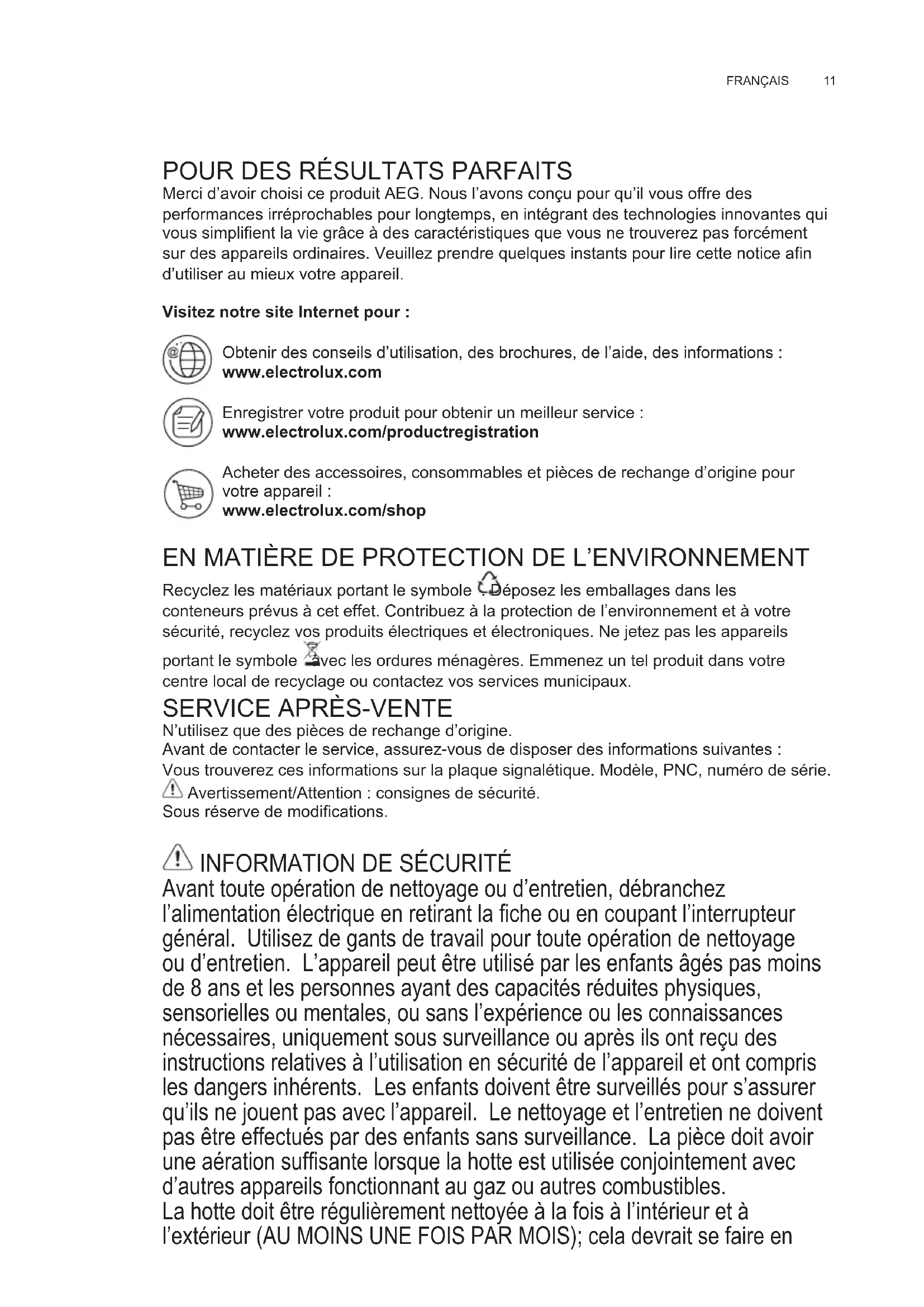 Avant toute opération de nettoyage ou d’entretien, débranchez l’alimentation électrique en retirant la che ou en coupant l’interrupteur général. Utilisez de gants de travail pour toute opération de nettoyage ou d’entretien. L’appareil peut être utilisé par les enfants âgés pas moins de 8 ans et les personnes ayant des capacités réduites physiques, sensorielles ou mentales, ou sans l’expérience ou les connaissances nécessaires, uniquement sous surveillance ou après ils ont reçu des instructions relatives à l’utilisation en sécurité de l’appareil et ont compris les dangers inhérents. Les enfants doivent être surveillés pour s’assurer qu’ils ne jouent pas avec l’appareil. Le nettoyage et l’entretien ne doivent pas être effectués par des enfants sans surveillance. La pièce doit avoir une aération sufsante lorsque la hotte est utilisée conjointement avec d’autres appareils fonctionnant au gaz ou autres combustibles. La hotte doit être régulièrement nettoyée à la fois à l’intérieur et à l’extérieur (AU MOINS UNE FOIS PAR MOIS); cela devrait se faire en FR MANUEL D’UTILISATIONwww.electrolux.com