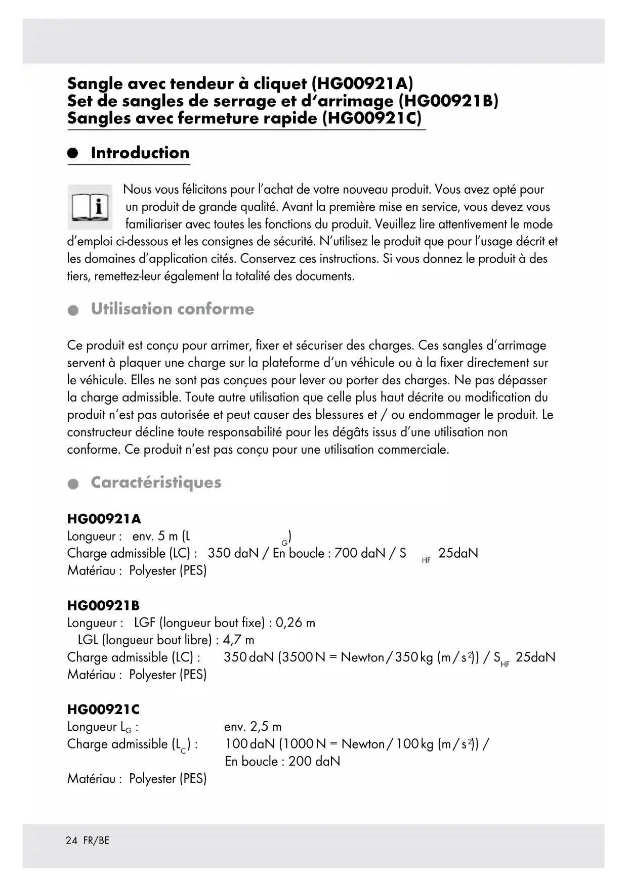Fourniture Contrôlez immédiatement après le déballage le contenu de livraison en ce qui concerne l‘intégralité du contenu de livraison, ainsi que l‘état irréprochage du produit et de toutes ses pièces. 1 x sangle avec tendeur à cliquet, env. 5 m (HG00921A) 1 x sangles d’arrimage avec cliquet tendeur et crochet en S, env. 0,26 m (HG00921B) 1 x sangles d’arrimage avec crochet en S, env. 4,7 m (HG00921B) 2 x sangles d’arrimage avec boucle zamak, env. 2,5 m (HG00921C) 1 x mode d’emploi