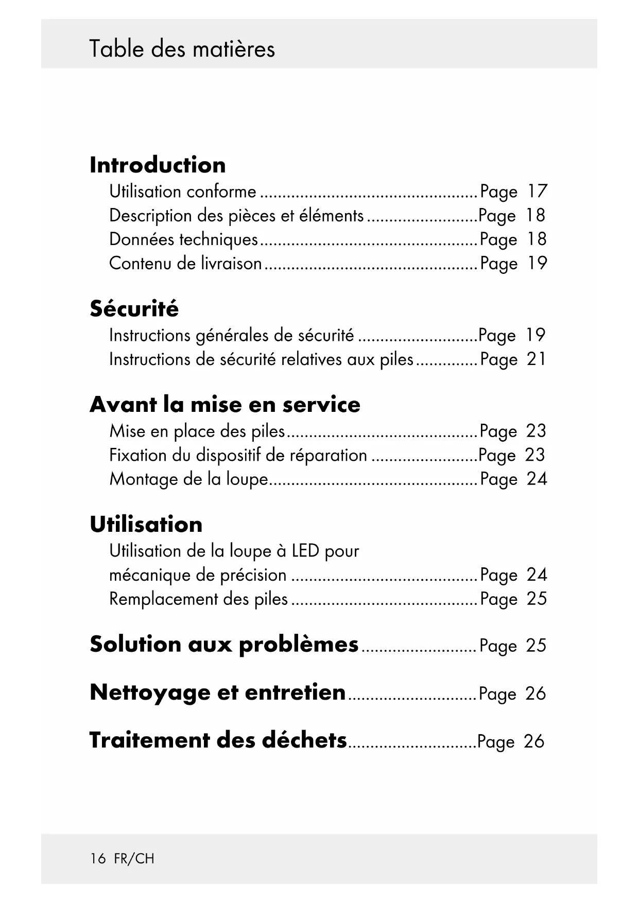 Umweltschäden durch falsche Entsorgung der Batterien! Batterien dürfen nicht über den Hausmüll entsorgt werden. Sie können giftige Schwermetalle enthalten und unterliegen der Sondermüllbehandlung. Die chemischen Symbole der Schwermetalle sind wie folgt: Cd = Cadmium, Hg = Queck- silber, Pb = Blei. Geben Sie deshalb verbrauchte Batterien bei einer kommunalen Sammelstelle ab.16 FR/CH Table des matières Introduction Utilisation conforme .................................................Page 17 Description des pièces et éléments .........................Page 18 Données techniques ................................................. Page 18 Contenu de livraison ................................................ Page 19 Sécurité Instructions générales de sécurité ...........................Page 19 Instructions de sécurité relatives aux piles .............. Page 21 Avant la mise en service Mise en place des piles ........................................... Page 23 Fixation du dispositif de réparation ........................Page 23 Montage de la loupe ...............................................Page 24 Utilisation Utilisation de la loupe à LED pour mécanique de précision ..........................................Page 24 Remplacement des piles ..........................................Page 25 Solution aux problèmes .......................... Page 25 Nettoyage et entretien ............................. Page 26 Traitement des déchets .............................Page 2617 FR/CH Introduction Loupe à LED pour travaux de précision Introduction Le mode d‘emploi fait partie de ce produit. Elle contient des indications importantes pour la sécurité, l‘utilisation et le traitement des déchets. Veuillez soigneusement lire toutes les indications d‘utilisation et de sécurité du produit. N‘utilisez l‘appareil que pour l‘usage décrit et que pour les domaines d‘application cités. Lors d‘une cession à tiers, veuillez également remettre tous les do- cuments. Utilisation conforme Ce produit est destiné au grossissement optique d’objets et est muni de lampes à LED. De plus, le produit dispose de 2 pinces de fixation et d’un porte-fer à souder. Toute autre utilisation ou modification du produit n‘est pas conforme et peut mener à des risques de blessures ou de dommages. Le fabriquant n‘assume aucune responsabilité pour les dom- mages causés suite à une utilisation contraire à celle décrite. Ce produit n‘est pas destiné à l‘usage professionnel. Ce produit ne peut pas servir d‘éclairage de pièce.18 FR/CH Introduction Description des pièces et éléments
