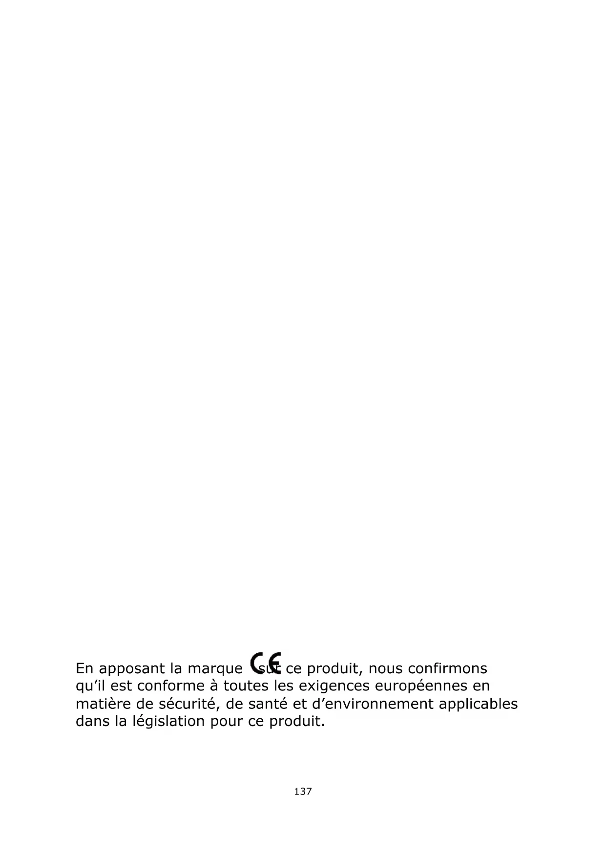 En apposant la marque sur ce produit, nous confirmons qu’il est conforme à toutes les exigences européennes en matière de sécurité, de santé et d’environnement applicables dans la législation pour ce produit.138