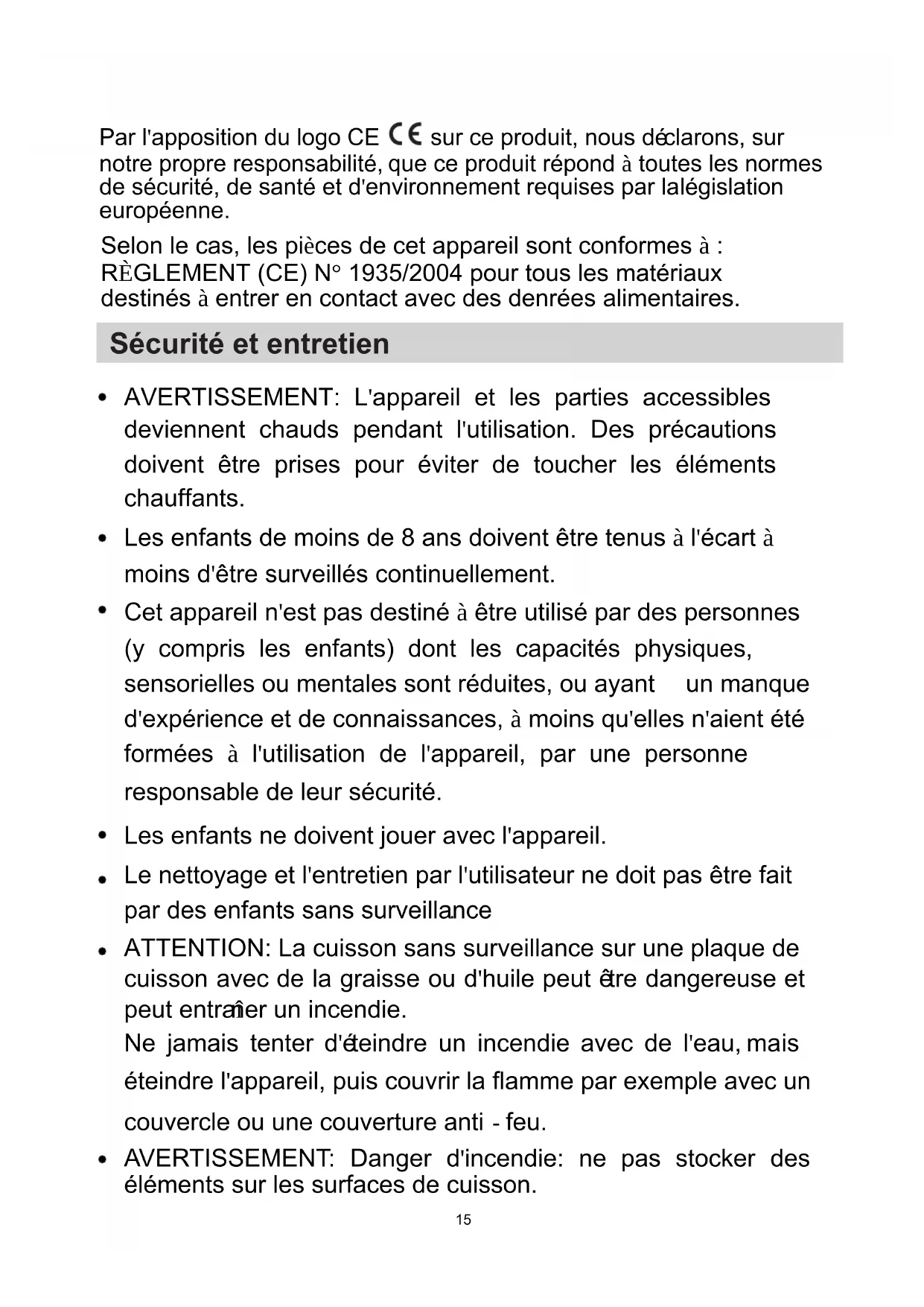 ENGLISHAVERTISSEMENT: L'appareil et les parties accessibles deviennent chauds pendant l'utilisation. Des précautions doivent être prises pour éviter de toucher les éléments chauffants. Les enfants de moins de 8 ans doivent être tenus à l'écart à moins d'être surveillés continuellement. Cet appareil n'est pas destiné à être utilisé par des personnes (y compris les enfants) dont les capacités physiques, sensorielles ou mentales sont réduites, ou ayant un manque d'expérience et de connaissances, à moins qu'elles n'aient été formées à l'utilisation de l'appareil, par une personne responsable de leur sécurité. Les enfants ne doivent jouer avec l'appareil. Le nettoyage et l'entretien par l'utilisateur ne doit pas être fait par des enfants sans surveillance. ATTENTION: La cuisson sans surveillance sur une plaque de cuisson avec de la graisse ou d'huile peut être dangereuse et peut entraîner un incendie. Ne jamais tenter d'éteindre un incendie avec de l'eau, mais éteindre l'appareil, puis couvrir la flamme par exemple avec un couvercle ou une couverture anti - feu.