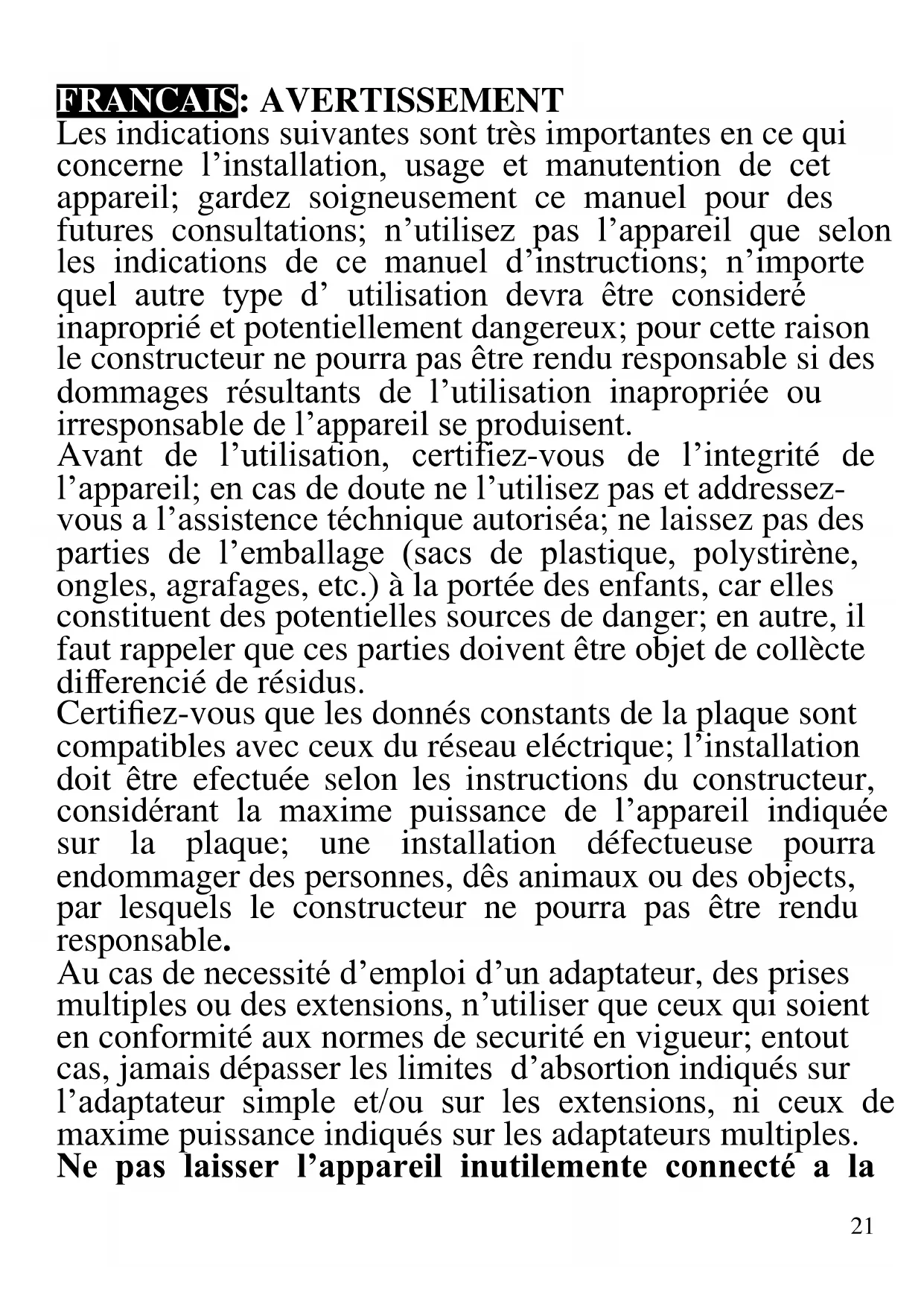 - Zubehör: Haken, Schläger, Mischbefestigung (H-Zubehör), Behälter21 FRANCAIS: AVERTISSEMENT Les indications suivantes sont très importantes en ce qui concerne l’installation, usage et manutention de cet appareil; gardez soigneusement ce manuel pour des futures consultations; n’utilisez pas l’appareil que selon les indications de ce manuel d’instructions; n’importe quel autre type d’ utilisation devra être consideré inaproprié et potentiellement dangereux; pour cette raison le constructeur ne pourra pas être rendu responsable si des dommages résultants de l’utilisation inapropriée ou irresponsable de l’appareil se produisent. Avant de l’utilisation, certifiez-vous de l’integrité de l’appareil; en cas de doute ne l’utilisez pas et addressez- vous a l’assistence téchnique autoriséa; ne laissez pas des parties de l’emballage (sacs de plastique, polystirène, ongles, agrafages, etc.) à la portée des enfants, car elles constituent des potentielles sources de danger; en autre, il faut rappeler que ces parties doivent être objet de collècte differencié de résidus. Certifiez-vous que les donnés constants de la plaque sont compatibles avec ceux du réseau eléctrique; l’installation doit être efectuée selon les instructions du constructeur, considérant la maxime puissance de l’appareil indiquée sur la plaque; une installation défectueuse pourra endommager des personnes, dês animaux ou des objects, par lesquels le constructeur ne pourra pas être rendu responsable. Au cas de necessité d’emploi d’un adaptateur, des prises multiples ou des extensions, n’utiliser que ceux qui soient en conformité aux normes de securité en vigueur; entout cas, jamais dépasser les limites d’absortion indiqués sur l’adaptateur simple et/ou sur les extensions, ni ceux de maxime puissance indiqués sur les adaptateurs multiples. Ne pas laisser l’appareil inutilemente connecté a la22 prise eléctrique; c’est toujours mieux de le déconnecter quand il n’est pas à l’use. Débranchez toujours l'appareil de l'alimentation électrique s'il est laissé sans surveillance. Pour le nettoyage déconnectez la fiche du secteur. Quand l’appareil soit hors usage et ait été décidé qu’il ne sera pas reparé, on reccomande son inutilisation, en coupant son câble d’alimentation. - Ne pas approcher le câble d’alimentation d’objects coupants ou de surfaces chaudes, et ne pas tirer sur le cordon d’alimentation pour le débrancher de la prise. Ne le laissez pas pendre du plan de travail où un enfant pourrait le tenir. - Ne pas utiliser l’appareil si le câble d’alimentation ou la fiche de connéction eléctrique sont endommagés, ou encore en cas de court-circuits; dans ce cas là, apporter l’appareil a un centre d’assistence autorisé. - L’appareil n’est pas indiqué pour être exposé à des conditions météorologiques défavorables (pluie, vent, humidité, la glace, etc.); Gardez-le dans un endroit sec. Jamais opérer ou même toucher l’appareil avec les mains mouillées ou les pieds nus. - Les enfants ne doivent pas jouer avec cet appareil. - Cet appareil peut être utilisé par des enfants agés de plus de 8 ans et par des personnes avec une réduite capacité phisique, sensorial ou mental, ou encore avec peu d’expérience à son usage, pourvu qu’une supervision adéquate leur en soit assuré, ou s’ils auraient été instruits à l’usage de l’appareil en complete securité. Les opérations de nettoyage e de manutention ne oivent pás être efectués par des enfants, sauf pour ceux qui sont agés de plus de 8 ans et sont supervisionés. - Gardez l’appareil et le câble d’alimentation hors la portée des enfants agés de moins de 8 ans. - N’utiliser que des accéssoires e pièces d’origine.23 Si le câble d'alimentation est endommagé ou en cas de panne et / ou de dysfonctionnement, ne modifiez pas l'appareil. Toute réparation doit être effectuée par le fabricant ou par son service d'assistance technique ou, en tout cas, par une personne possédant une qualification similaire, afin d'éviter tout risque. Le non-respect de ce qui précède peut compromettre la sécurité de l'appareil et invalider les conditions de la garantie. ATTENTION: Cet appareil comporte une fonction de chauffage. Quelques surfaces, même si non la plaque elle même, pourront atteindre des températures élevées. Étant donné que la sensibilité à la température diffère de personne à personne, cet appareil devrà être usé avec PRUDENCE. Placez l’appareil sur des surfaces adéhrentes et préparées pour cet effet, et utilisez les mésures de protection contre la chaleur conseillées. - Cet appareil est destiné à être utilisé dans les ménages et des applications similaires: les cuisines du personnel dans les magasins, bureaux et autres environnements de travail, pour les clients dans les hôtels, motels et autres environnements de type résidentiel, de type lit et petit- déjeuner, hébergement. - L’appareil n’est pas conçu pour être utilisé avec une minuterie extérieure ou une commande à distance. - Avant chaque utilisation, effectuez le cordon d'alimentation. Ne soumettez pas le produit à des chocs susceptibles de l'endommager. - Tenir l’appareil à l’écart des environnements où il peut y avoir des gaz, vapeurs, des substances inflammables ou explosives.