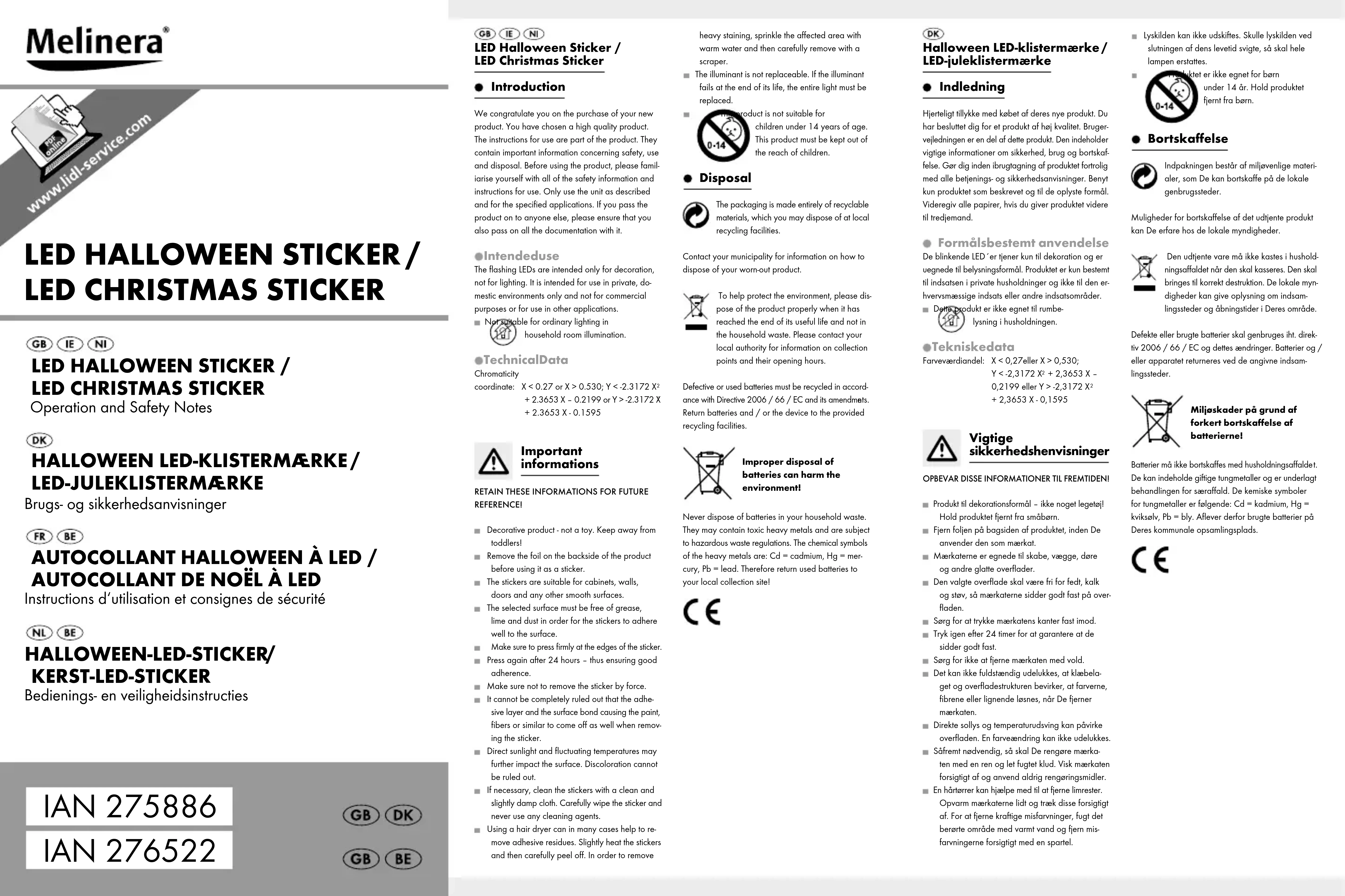 Pour obtenir des renseignements concernant les points de collecte et leurs horaires d’ou- verture, vous pouvez contacter votre muni- cipalité. Les piles défectueuses ou usagées doivent être recy- clées conformément à la directive 2006 / 66 / CE et ses modifications. Les piles et / ou l‘appareil doivent être retournés dans les centres de collecte existants. Pollution de l’environnement causée par une mise au rebut incorrecte des piles! Les piles ne doivent pas être mises au rebut dans les ordures ménagères. Elles peuvent contenir des métaux lourds toxiques et doivent être considérées comme des déchets spéciaux. Les symboles chimiques des métaux lourds sont les suivants: Cd = cadmium, Hg = mercure, Pb = plomb. Pour cette raison, veuillez tou- jours déposer les piles usagées dans les conteneurs de recyclage de la commune. OWIM GmbH & Co. KG Stiftsbergstraße 1 D-74167 Neckarsulm IAN Model Version 275886 HG01177A–J 06 / 2016 276522 HG01176A–J 07 / 2016 Last Information Update · Tilstand af information · Version des informations Stand van de informatie: 05 / 2016 · Ident.-No.: HG01177A-J / HG01176A-J052016-GB / DK / BE