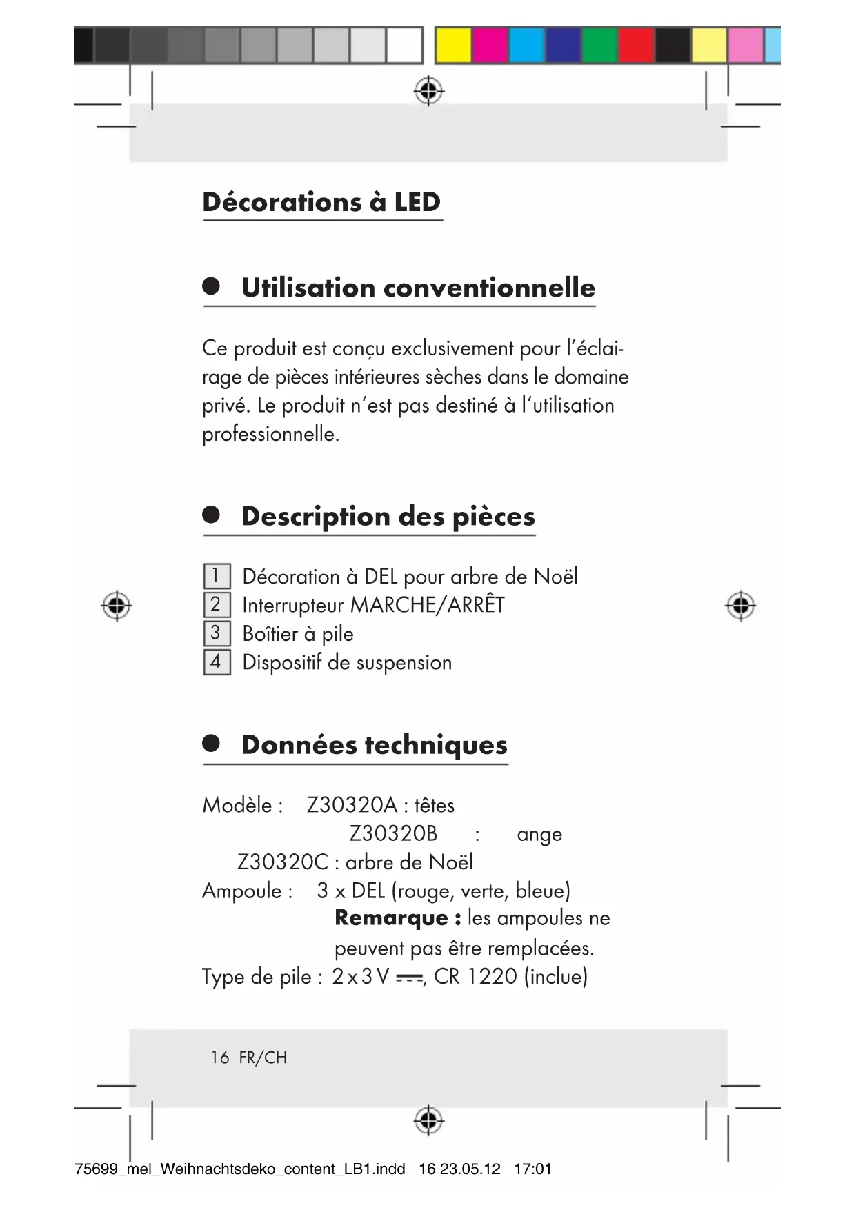 Contenu de livraison Z30320A : 4 têtes de décoration à DEL pour arbre de Noël (ours, bonhomme de neige, cerf, papa Noël) 8 piles, 3 V , CR1220 1 mode d’emploi Z30320B : 4 décorations à DEL pour arbre de Noël, ange 8 piles, 3 V , CR1220 1 mode d’emploi Z30320C : 2 décorations à DEL pour arbre de Noël, sapin de Noël (grand/petit) 4 piles, 3 V , CR1220 1 mode d’emploi Indications de sécurité VEUILLEZ S‘IL VOUS PLAÎT LIRE LE MODE D‘EMPLOI AVANT L‘UTILISATON ! LE MODE
