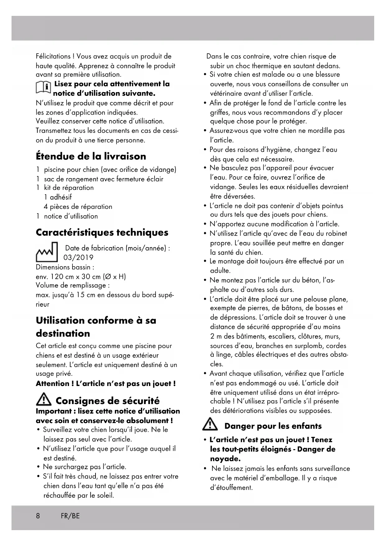 12 heures avant de regonfler. Stockage, nettoyage Changez fréquemment l’eau de l’article, surtout par temps chaud et lorsqu’elle est sale ! Conser- ver toujours l’article dans un endroit sec, propre et tempéré. Plier et placer l’article dans le sac de rangement seulement lorsqu’il est complètement sec. L’orifice de vidange doit toujours être fermé pendant le stockage. Nettoyer uniquement avec de l’eau ou de l’eau savonneuse douce, jamais avec des détergents agressifs. Lors du stockage pendant l’hiver, ne pas poser d’objets coupants sur l’article et ne pas appliquer de talc. Mise au rebut Éliminez l’article et le matériel d’emballage conformément aux directives locales en vigueur. Le matériel d’emballage tel que les sachets en plastique par exemple ne doivent pas arriver dans les mains des enfants. Conservez le maté- riel d’emballage hors de portée des enfants. Ce produit est recyclable. Il est soumis à la responsabilité élargie du fabricant et est collecté séparément. Éliminez les produits et les emballages dans le respect de l‘environnement. Le code de recyclage est utilisé pour identifier les différents matériaux pour le retour dans le circuit de recyclage. Le code se compose du symbole de recyclage, qui doit correspondre au circuit de recyclage, et d‘un numéro identifiant le matériau. Indications concernant la garantie et le service après- vente Le produit a été fabriqué avec le plus grand soin et sous un contrôle permanent. Vous avez sur ce produit une garantie de trois ans à partir de la date d’achat. Conservez le ticket de caisse. La garantie est uniquement valable pour les défauts de matériaux et de fabrication, elle perd sa validité en cas de maniement incorrect ou non conforme. FR/BE10 Vos droits légaux, tout particulièrement les droits relatifs à la garantie, ne sont pas limitées par cette garantie. En cas d‘éventuelles réclamations, veuillez vous adresser à la hotline de garantie indiquée ci-dessous ou nous contacter par e-mail. Nos employés du service client vous indiqueront la marche à suivre le plus rapidement possible. Nous vous renseignerons personnellement dans tous les cas. La période de garantie n’est pas prolongée par d’éventuelles réparations sous la garantie, les garanties implicites ou le remboursement. Ceci s’applique également aux pièces remplacées et réparées. Les réparations nécessaires sont à la charge de l’acheteur à la fin de la période de garantie. Article L217-16 du Code de la consommation Lorsque l‘acheteur demande au vendeur, pendant le cours de la garantie commerciale qui lui a été consentie lors de l‘acquisition ou de la réparation d‘un bien meuble, une remise en état couverte par la garantie, toute période d‘immobilisation d‘au moins sept jours vient s‘ajouter à la durée de la garantie qui restait à courir. Cette période court à compter de la demande d‘intervention de l‘acheteur ou de la mise à disposition pour réparation du bien en cause, si cette mise à disposition est postérieure à la demande d‘intervention. Indépendamment de la garantie commerciale souscrite, le vendeur reste tenu des défauts de conformité du bien et des vices rédhibitoires dans les conditions prévues aux articles L217-4 à L217-13 du Code de la consommation et aux articles 1641 à 1648 et 2232 du Code Civil. Article L217-4 du Code de la consommation Le vendeur livre un bien conforme au contrat et répond des défauts de conformité existant lors de la délivrance. Il répond également des défauts de conformité résultant de l‘emballage, des instructions de montage ou de l‘installation lorsque celle-ci a été mise à sa charge par le contrat ou a été réalisée sous sa responsabilité. Article L217-5 du Code de la consommation Le bien est conforme au contrat : 1° S´il est propre à l‘usage habituellement attendu d‘un bien semblable et, le cas échéant :