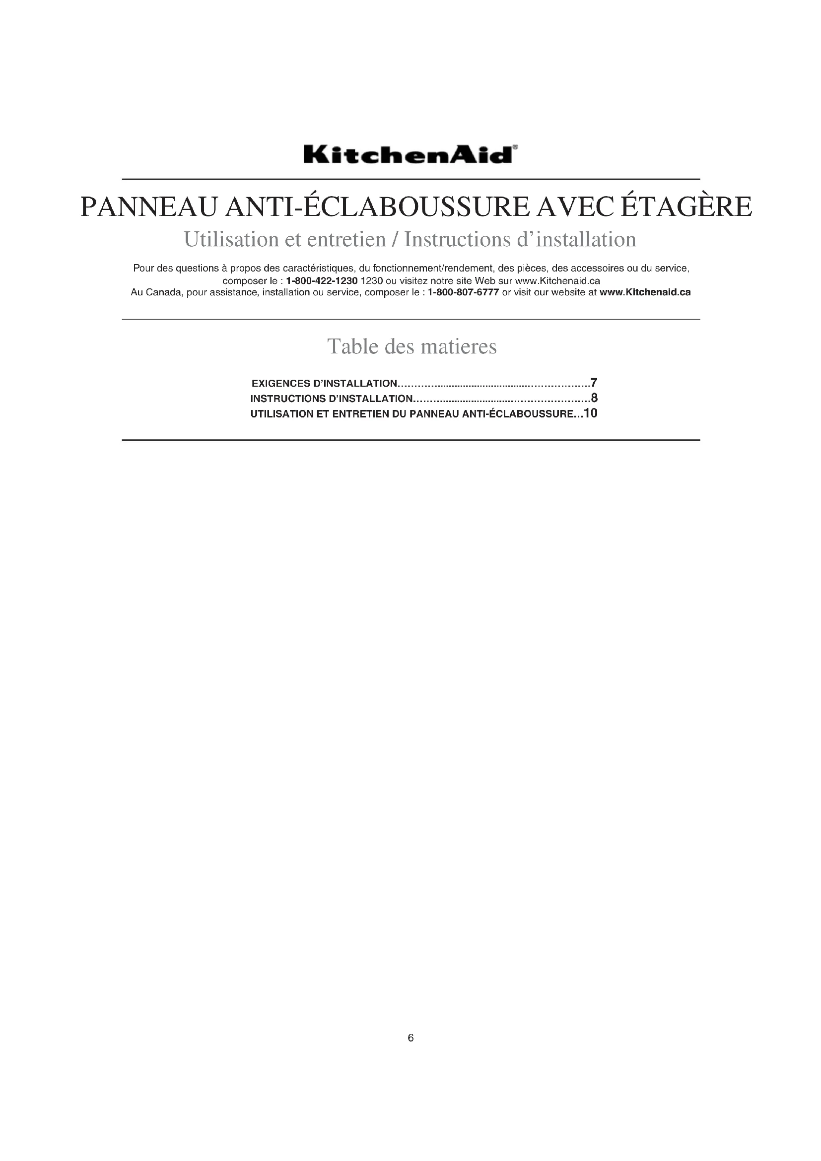 Utilisation et entretien / Instructions d’installation Pour des questions à propos des caractéristiques, du fonctionnement/rendement, des pièces, des accessoires ou du service, composer le : 1-800-422-1230 1230 ou visitez notre site Web sur www.Kitchenaid.ca Au Canada, pour assistance, installation ou service, composer le : 1-800-807-6777 or visit our website at www.Kitchenaid.ca Table des matieres EXIGENCES D’INSTALLATION…………................................……………….7INSTRUCTIONS D’INSTALLATION………........................……………………8UTILISATION ET ENTRETIEN DU PANNEAU ANTI-ÉCLABOUSSURE…10