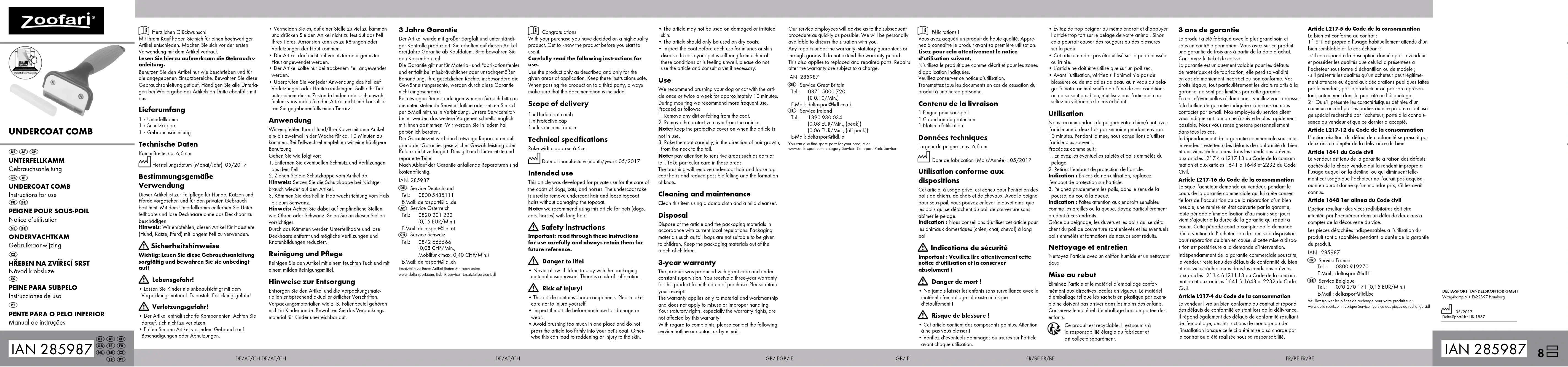 - Cet article contient des composants pointus. Attention à ne pas vous blesser !• Vérifiez d‘éventuels dommages ou usures sur l‘article avant chaque utilisation.• Évitez de trop peigner au même endroit et d‘appuyer l‘article trop fort sur le pelage de votre animal. Sinon cela pourrait causer des rougeurs ou des blessures sur la peau.• Cet article ne doit pas être utilisé sur la peau blessée ou irritée.• L‘article ne doit être utilisé que sur un poil sec.• Avant l‘utilisation, vérifiez si l‘animal n‘a pas de blessures ou de maladies de peau au niveau du pela- ge. Si votre animal souffre de l‘une de ces conditions ou ne se sent pas bien, n‘utilisez pas l‘article et con- sultez un vétérinaire le cas échéant. Utilisation Nous recommandons de peigner votre chien/chat avec l‘article une à deux fois par semaine pendant environ 10 minutes. Pendant la mue, nous conseillons d‘utiliser l‘article plus souvent.Procédez comme suit : 1. Enlevez les éventuelles saletés et poils emmêlés du pelage.2. Retirez l‘embout de protection de l‘article.Indication : En cas de non-utilisation, replacez l‘embout de protection sur l‘article.3. Peignez prudemment les poils, dans le sens de la pousse, du cou à la queue.Indication : Faites attention aux endroits sensibles comme les oreilles ou la queue. Soyez particulièrement prudent à ces endroits.Grâce au peignage, les duvets et les poils qui se déta-chent du poil de couverture sont enlevés et les éventuels poils emmêlés et formations de nœuds sont réduits. Nettoyage et entretien Nettoyez l’article avec un chiffon humide et un nettoyant doux. Mise au rebut Éliminez l‘article et le matériel d‘emballage confor-mément aux directives locales en vigueur. Le matériel d‘emballage tel que les sachets en plastique par exem-ple ne doivent pas arriver dans les mains des enfants. Conservez le matériel d‘emballage hors de portée des enfants. Ce produit est recyclable. Il est soumis à la responsabilité élargie du fabricant et est collecté séparément.DE/AT/CH 3 Jahre Garantie Der Artikel wurde mit großer Sorgfalt und unter ständi-ger Kontrolle produziert. Sie erhalten auf diesen Artikel drei Jahre Garantie ab Kaufdatum. Bitte bewahren Sie den Kassenbon auf. Die Garantie gilt nur für Material- und Fabrikationsfehler und entfällt bei missbräuchlicher oder unsachgemäßer Behandlung. Ihre gesetzlichen Rechte, insbesondere die Gewährleistungsrechte, werden durch diese Garantie nicht eingeschränkt. Bei etwaigen Beanstandungen wenden Sie sich bitte an die unten stehende Service-Hotline oder setzen Sie sich per E-Mail mit uns in Verbindung. Unsere Servicemitar-beiter werden das weitere Vorgehen schnellstmöglich mit Ihnen abstimmen. Wir werden Sie in jedem Fall persönlich beraten.Die Garantiezeit wird durch etwaige Reparaturen auf-grund der Garantie, gesetzlicher Gewährleistung oder Kulanz nicht verlängert. Dies gilt auch für ersetzte und reparierte Teile. Nach Ablauf der Garantie anfallende Reparaturen sind kostenpflichtig.IAN: 285987 Service Deutschland Tel.: 0800-5435111 E-Mail: deltasport@lidl.de Service Österreich Tel.: 0820 201 222 (0,15 EUR/Min.) E-Mail: deltasport@lidl.at Service Schweiz Tel.: 0842 665566 (0,08 CHF/Min., Mobilfunk max. 0,40 CHF/Min.) E-Mail: deltasport@lidl.chErsatzteile zu Ihrem Artikel finden Sie auch unter: www.delta-sport.com, Rubrik Service - Ersatzteilservice LidlFR/BE FR/BE 3 ans de garantie Le produit a été fabriqué avec le plus grand soin et sous un contrôle permanent. Vous avez sur ce produit une garantie de trois ans à partir de la date d’achat. Conservez le ticket de caisse. La garantie est uniquement valable pour les défauts de matériaux et de fabrication, elle perd sa validité en cas de maniement incorrect ou non conforme. Vos droits légaux, tout particulièrement les droits relatifs à la garantie, ne sont pas limitées par cette garantie. En cas d‘éventuelles réclamations, veuillez vous adresser à la hotline de garantie indiquée ci-dessous ou nous contacter par e-mail. Nos employés du service client vous indiqueront la marche à suivre le plus rapidement possible. Nous vous renseignerons personnellement dans tous les cas.Indépendamment de la garantie commerciale souscrite, le vendeur reste tenu des défauts de conformité du bien et des vices rédhibitoires dans les conditions prévues aux articles L217-4 a L217-13 du Code de la consom-mation et aux articles 1641 a 1648 et 2232 du Code Civil.Article L217-16 du Code de la consommation Lorsque l‘acheteur demande au vendeur, pendant le cours de la garantie commerciale qui lui a été consen-tie lors de l‘acquisition ou de la réparation d‘un bien meuble, une remise en état couverte par la garantie, toute période d‘immobilisation d‘au moins sept jours vient s‘ajouter a la durée de la garantie qui restait a courir. Cette période court a compter de la demande d‘intervention de l‘acheteur ou de la mise a disposition pour réparation du bien en cause, si cette mise a dispo-sition est postérieure a la demande d‘intervention.Indépendamment de la garantie commerciale souscrite, le vendeur reste tenu des défauts de conformité du bien et des vices rédhibitoires dans les conditions prévues aux articles L211-4 à L211-13 du Code de la consom-mation et aux articles 1641 à 1648 et 2232 du Code Civil.Article L217-4 du Code de la consommationLe vendeur livre un bien conforme au contrat et répond des défauts de conformité existant lors de la délivrance.Il répond également des défauts de conformité résultant de l‘emballage, des instructions de montage ou de l‘installation lorsque celle-ci a été mise a sa charge par le contrat ou a été réalisée sous sa responsabilité.Article L217-5 du Code de la consommationLe bien est conforme au contrat :1° S´il est propre a l‘usage habituellement attendu d‘un bien semblable et, le cas échéant :- s‘