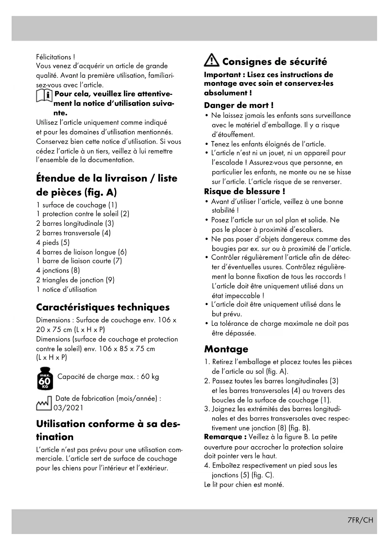 Capacité de charge max. : 60 kg Date de fabrication (mois/année) : 03/2021 Utilisation conforme à sa des- tination L’article n’est pas prévu pour une utilisation com- merciale. L’article sert de surface de couchage pour les chiens pour l’intérieur et l’extérieur. Consignes de sécurité Important : Lisez ces instructions de montage avec soin et conservez-les absolument ! Danger de mort !