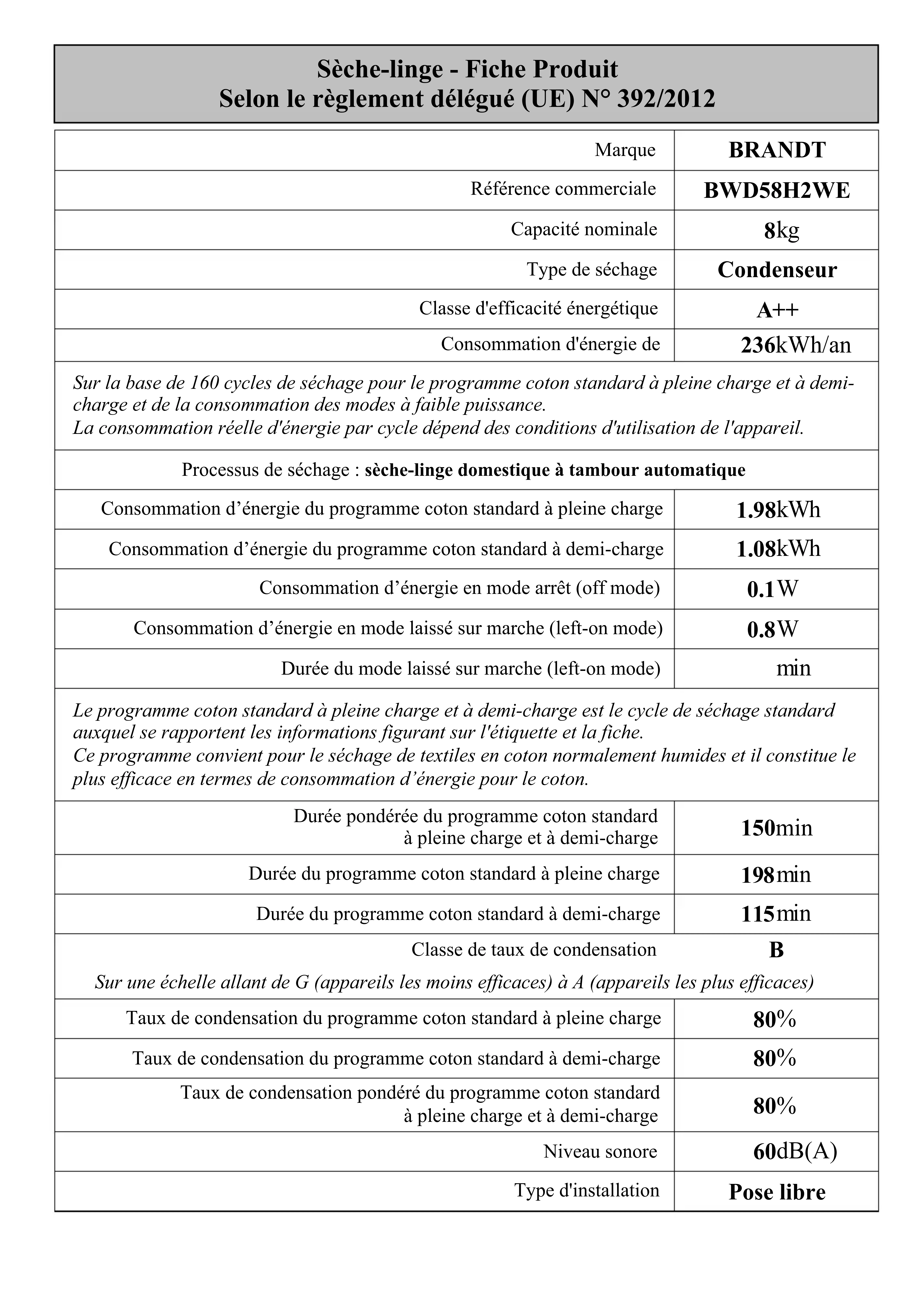 Sèche-linge - Fiche Produit Selon le règlement délégué (UE) N° 392/2012 Marque BRANDT Référence commerciale