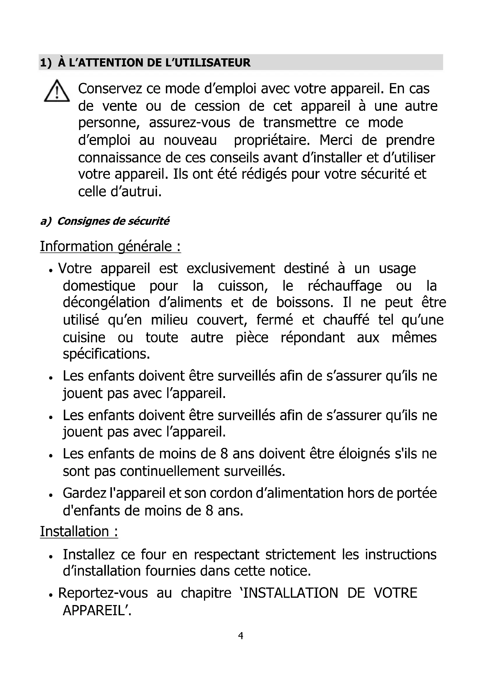 Conservez ce mode d’emploi avec votre appareil. En cas de vente ou de cession de cet appareil à une autre personne, assurez-vous de transmettre ce mode d’emploi au nouveau propriétaire. Merci de prendre connaissance de ces conseils avant d’installer et d’utiliser votre appareil. Ils ont été rédigés pour votre sécurité et celle d’autrui. a) Consignes de sécurité Information générale : Votre appareil est exclusivement destiné à un usage domestique pour la cuisson, le réchauffage ou la décongélation d’aliments et de boissons. Il ne peut être utilisé qu’en milieu couvert, fermé et chauffé tel qu’une cuisine ou toute autre pièce répondant aux mêmes spécifications. Les enfants doivent être surveillés afin de s’assurer qu’ils ne jouent pas avec l’appareil. Les enfants doivent être surveillés afin de s’assurer qu’ils ne jouent pas avec l’appareil. Les enfants de moins de 8 ans doivent être éloignés s'ils ne sont pas continuellement surveillés. Gardez l'appareil et son cordon d’alimentation hors de portée d'enfants de moins de 8 ans. Installation : Installez ce four en respectant strictement les instructions d’installation fournies dans cette notice. Reportez-vous au chapitre ‘INSTALLATION DE VOTRE APPAREIL’.5 Veillez à ne pas obstruer les ouïes d’aérations de votre appareil. Votre appareil n’est pas destiné à être installé dans une niche de meuble. Si cet appareil est recouvert ou en contact avec un matériau inflammable y compris rideaux, tentures et éléments similaires, il existe un risque d’incendie lors de son fonctionnement. Éloignez le cordon d’alimentation des surfaces chaudes et ne couvrez pas ou n’encastrez pas le four. Votre appareil n’est pas destiné à être mis en fonctionnement au moyen d’une minuterie extérieure ou par un système de commande à distance séparé. Utilisation : Les parties accessibles de cet appareil peuvent devenir chaude pendant son fonctionnement. Les liquides ou autres aliments ne doivent pas être chauffés dans des récipients hermétiques car ils risquent d’exploser. Votre appareil ne peut être utilisé par des enfants à partir de 8 ans et des personnes ayant des capacités physiques, sensorielles ou mentales réduites ou un manque d'expérience et de connaissance que s'ils sont assistés ou si on leur a donné les instructions appropriées leur permettant de se servir de l'appareil en toute sécurité et de comprendre les risques encourus. Les parties accessibles de votre appareil chauffent pendant son utilisation. Les enfants doivent être éloignés s'ils ne sont pas continuellement surveillés.6 Ne placez aucun élément sur l’appareil lorsqu’il est en fonctionnement. Vérifiez que les ustensiles sont appropriés à l’usage dans un four à microondes. Utilisez toujours des gants isolants pour retirer les plats du four. Certains plats absorbent la chaleur des aliments, et sont donc très chauds. En utilisation « micro-onde » ou « micro-onde combinée à un autre mode de cuisson », n’utilisez pas de récipient métallique, ôtez les liens métalliques de fermeture et les poignées métalliques des récipients / sacs avant de les introduire dans le four. Pour ne pas détériorer votre appareil, ne jamais le faire fonctionner à vide ou sans plateau. Dans le cas de petites quantités, posez un verre d’eau à côté de l’aliment pour augmenter la charge Le chauffage de boissons par micro-ondes peut provoquer un jaillissement brusque et différé de liquide en ébullition, aussi des précautions doivent être prises lorsqu’on manipule le récipient. Afin d’éviter les brûlures, le contenu des biberons et des pots d’aliments pour bébés doit être remué ou agité et la température doit être vérifiée avant consommation. Il est recommandé de ne pas chauffer les œufs dans leur coquille et les œufs durs entiers dans un four micro-ondes car ils risquent d’exploser, même après la fin de la cuisson. N’utilisez pas de papier aluminium de cuisson pour couvrir les aliments, ne recouvrez pas une partie du four avec du papier aluminium.7 Pendant le chauffage de denrées alimentaires dans des contenants en plastique ou en papier, gardez un œil sur le four en raison de la possibilité d’inflammation. Si de la fumée s’échappe de l’appareil, arrêtez ou débranchez le four et gardez la porte fermée pour étouffer les flammes éventuelles. L’utilisation d’accessoires non recommandés par le fabricant de l’appareil peut entraîner des situations dangereuses et des blessures. N’utilisez pas le compartiment du four à des fins de rangement. Ne placez pas d’aliments tels que le pain, les gâteaux secs, etc. à l’intérieur du four. Entretien : L’absence d’entretien du four peut entraîner la détérioration des surfaces de la cavité ou de la porte et peut altérer irréversiblement la durée de vie de l’appareil et provoquer des situations dangereuses. Éteignez et débranchez l’appareil avant toute opération d’entretien. Votre appareil génère des microondes et contient un circuit haute-tension, n’enlevez pas le capot. Il est dangereux pour toute personne non qualifiée de réaliser des opérations de maintenance qui nécessiteraient de retirer le capot de protection de l’appareil. Ôter le capot de protection de l’appareil peut entrainer une exposition à l’énergie micro-onde. Ôter le capot de protection de l’appareil, même si il est débranché, peut entrainer une électrocution au contact du circuit haute-tension.8 Le nettoyage et l’entretien de l’appareil ne doivent pas être faits par des enfants de moins de 8 ans. Votre appareil doit être nettoyé régulièrement. Les dépôts alimentaires doivent être enlevés. Ne nettoyez pas l’appareil avec une éponge abrasive ou un grattoir métallique. Pour votre sécurité, ne nettoyez jamais l'appareil à l'aide d'un nettoyeur à vapeur. Le j