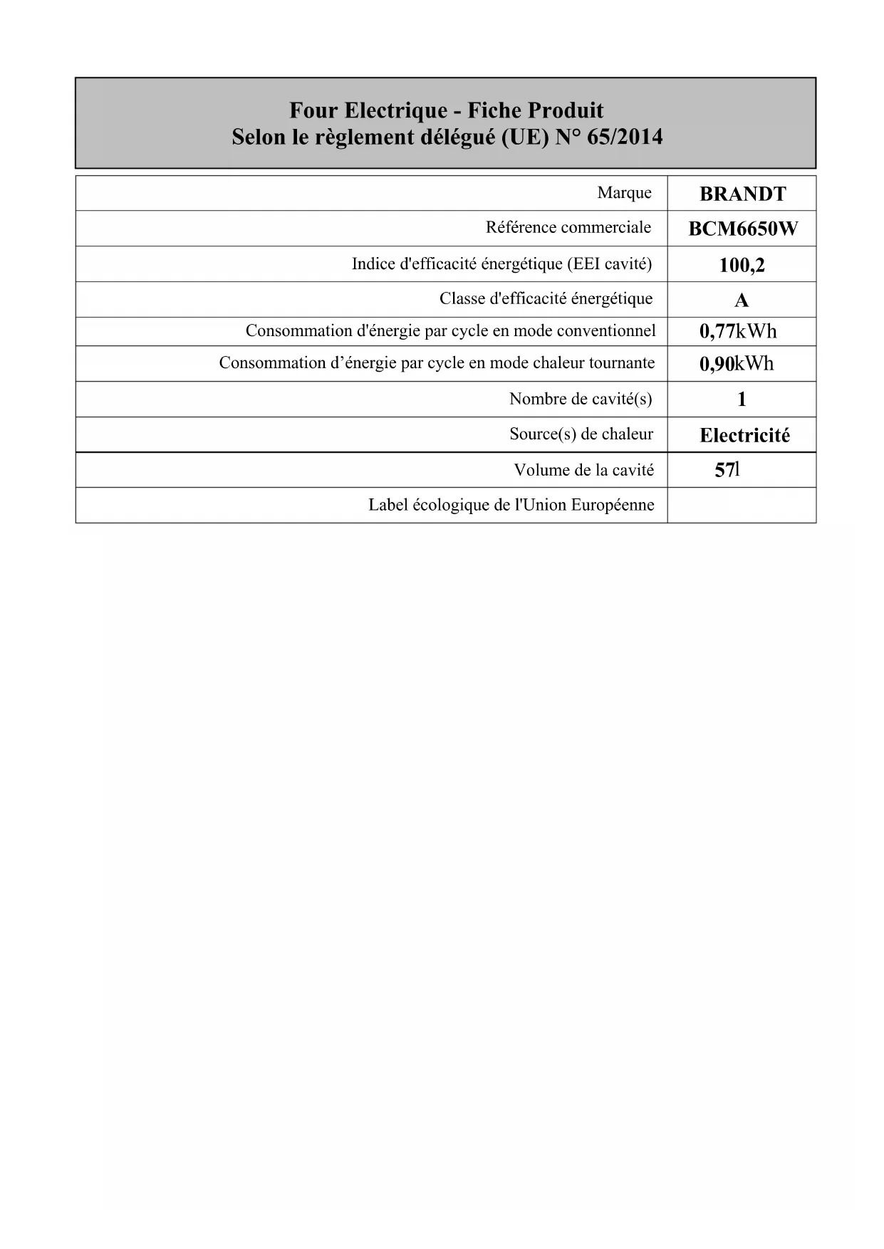 Four Electrique - Fiche Produit Selon le règlement délégué (UE) N° 65/2014 Marque BRANDT Référence commerciale BCM6650W Indice d'efficacité énergétique (EEI cavité) 100,2 Classe d'efficacité énergétique