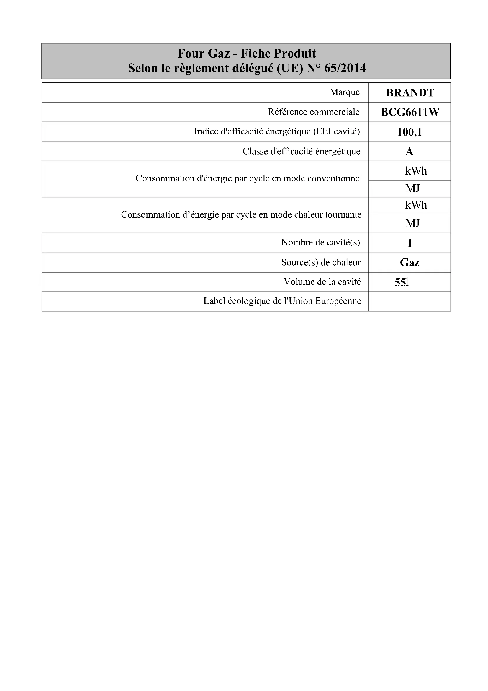 Four Gaz - Fiche Produit Selon le règlement délégué (UE) N° 65/2014 Marque BRANDT Référence commerciale BCG6611W Indice d'efficacité énergétique (EEI cavité) 100,1 Classe d'efficacité énergétique