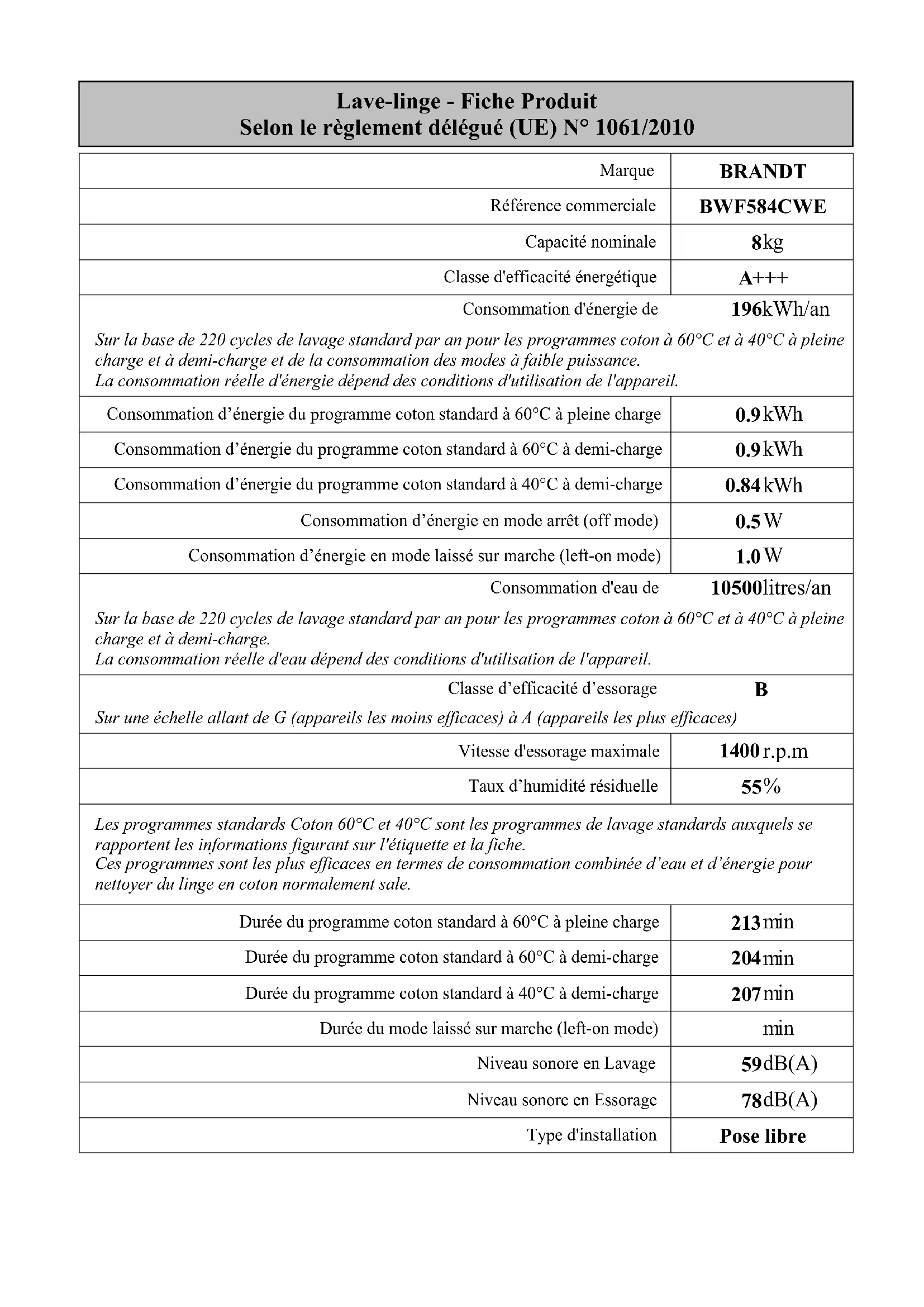 Lave-linge - Fiche Produit Selon le règlement délégué (UE) N° 1061/2010 Marque BRANDT Référence commerciale BWF584CWE Capacité nominale