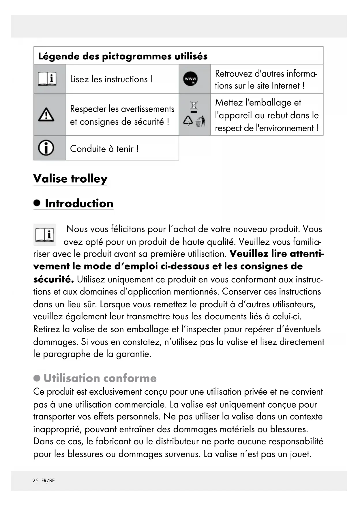 Mettez l'emballage et l'appareil au rebut dans le respect de l'environnement ! Conduite à tenir ! Valise trolley Introduction Nous vous félicitons pour l‘achat de votre nouveau produit. Vous avez opté pour un produit de haute qualité. Veuillez vous familia- riser avec le produit avant sa première utilisation. Veuillez lire attenti- vement le mode d‘emploi ci-dessous et les consignes de sécurité. Utilisez uniquement ce produit en vous conformant aux instruc- tions et aux domaines d‘application mentionnés. Conserver ces instructions dans un lieu sûr. Lorsque vous remettez le produit à d‘autres utilisateurs, veuillez également leur transmettre tous les documents liés à celui-ci. Retirez la valise de son emballage et l‘inspecter pour repérer d‘éventuels dommages. Si vous en constatez, n‘utilisez pas la valise et lisez directement