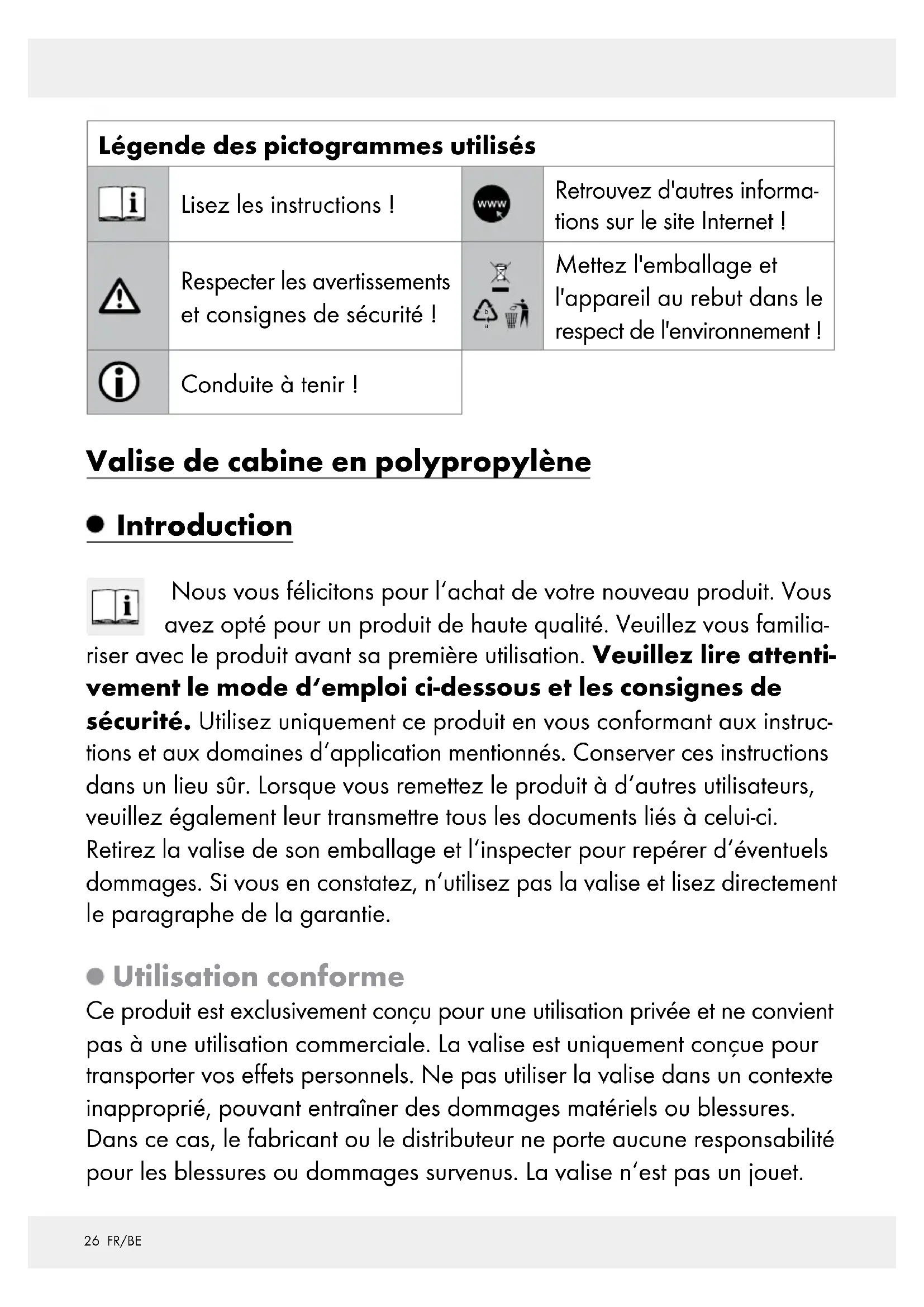 Mettez l'emballage et l'appareil au rebut dans le respect de l'environnement ! Conduite à tenir ! Valise de cabine en polypropylène Introduction Nous vous félicitons pour l‘achat de votre nouveau produit. Vous avez opté pour un produit de haute qualité. Veuillez vous familia- riser avec le produit avant sa première utilisation. Veuillez lire attenti- vement le mode d‘emploi ci-dessous et les consignes de sécurité. Utilisez uniquement ce produit en vous conformant aux instruc- tions et aux domaines d‘application mentionnés. Conserver ces instructions dans un lieu sûr. Lorsque vous remettez le produit à d‘autres utilisateurs, veuillez également leur transmettre tous les documents liés à celui-ci. Retirez la valise de son emballage et l‘inspecter pour repérer d‘éventuels dommages. Si vous en constatez, n‘utilisez pas la valise et lisez directement
