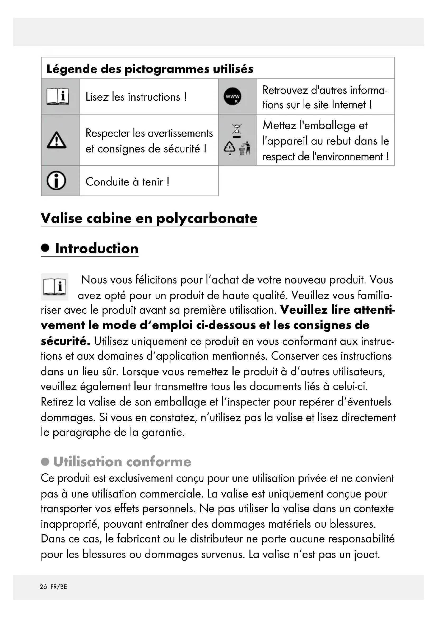 Mettez l'emballage et l'appareil au rebut dans le respect de l'environnement ! Conduite à tenir ! Valise cabine en polycarbonate Introduction Nous vous félicitons pour l‘achat de votre nouveau produit. Vous avez opté pour un produit de haute qualité. Veuillez vous familia- riser avec le produit avant sa première utilisation. Veuillez lire attenti- vement le mode d‘emploi ci-dessous et les consignes de sécurité. Utilisez uniquement ce produit en vous conformant aux instruc- tions et aux domaines d‘application mentionnés. Conserver ces instructions dans un lieu sûr. Lorsque vous remettez le produit à d‘autres utilisateurs, veuillez également leur transmettre tous les documents liés à celui-ci. Retirez la valise de son emballage et l‘inspecter pour repérer d‘éventuels dommages. Si vous en constatez, n‘utilisez pas la valise et lisez directement