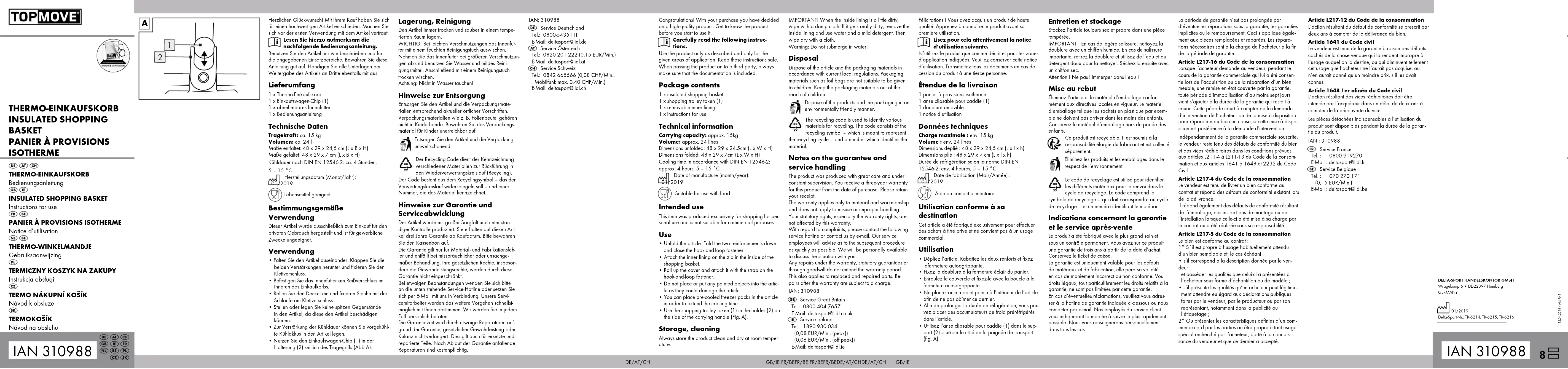 - Dépliez l‘article. Rabattez les deux renforts et fixez lafermeture autoagrippante.• Fixez la doublure à la fermeture éclair du panier.• Enroulez le couvercle et fixez-le avec la boucle à la fermeture auto-agrippante.• Ne placez aucun objet pointu à l’intérieur de l’article afin de ne pas abîmer ce dernier.• Afin de prolonger la durée de réfrigération, vous pou-vez placer des accumulateurs de froid préréfrigérés dans l‘article.• Utilisez l‘anse clipsable pour caddie (1) dans le sup-port (2) situé sur le côté de la poignée de transport (fig. A). Entretien et stockage Stockez l’article toujours sec et propre dans une pièce tempérée. IMPORTANT ! En cas de légère salissure, nettoyez la doublure avec un chiffon humide. En cas de salissure importante, retirez la doublure et utilisez de l’eau et du détergent doux pour la nettoyer. Séchez-la ensuite avec un chiffon sec.Attention ! Ne pas l’immerger dans l’eau ! Mise au rebut Éliminez l‘article et le matériel d‘emballage confor-mément aux directives locales en vigueur. Le matériel d‘emballage tel que les sachets en plastique par exem-ple ne doivent pas arriver dans les mains des enfants. Conservez le matériel d‘emballage hors de portée des enfants. Ce produit est recyclable. Il est soumis à la responsabilité élargie du fabricant et est collecté séparément.Éliminez les produits et les emballages dans le respect de l’environnement.Le code de recyclage est utilisé pour identifier les différents matériaux pour le renvoi dans le cycle de recyclage. Le code comprend le symbole de recyclage – qui doit correspondre au cycle de recyclage – et un numéro identifiant le matériau. Indications concernant la garantie et le service après-vente Le produit a été fabriqué avec le plus grand soin et sous un contrôle permanent. Vous avez sur ce produit une garantie de trois ans à partir de la date d’achat. Conservez le ticket de caisse. La garantie est uniquement valable pour les défauts de matériaux et de fabrication, elle perd sa validité en cas de maniement incorrect ou non conforme. Vos droits légaux, tout particulièrement les droits relatifs à la garantie, ne sont pas limitées par cette garantie. En cas d‘éventuelles réclamations, veuillez vous adres-ser à la hotline de garantie indiquée ci-dessous ou nous contacter par e-mail. Nos employés du service client vous indiqueront la marche à suivre le plus rapidement possible. Nous vous renseignerons personnellement dans tous les cas.La période de garantie n‘est pas prolongée par d’éventuelles réparations sous la garantie, les garanties implicites ou le remboursement. Ceci s‘applique égale-ment aux pièces remplacées et réparées. Les répara-tions nécessaires sont à la charge de l’acheteur à la fin de la période de garantie. Article L217-16 du Code de la consommation Lorsque l‘acheteur demande au vendeur, pendant le cours de la garantie commerciale qui lui a été consen-tie lors de l‘acquisition ou de la réparation d‘un bien meuble, une remise en état couverte par la garantie, toute période d‘immobilisation d‘au moins sept jours vient s‘ajouter à la durée de la garantie qui restait à courir. Cette période court à compter de la demande d‘intervention de l‘acheteur ou de la mise à disposition pour réparation du bien en cause, si cette mise à dispo-sition est postérieure à la demande d‘intervention.Indépendamment de la garantie commerciale souscrite, le vendeur reste tenu des défauts de conformité du bien et des vices rédhibitoires dans les conditions prévues aux articles L211-4 à L211-13 du Code de la consom-mation et aux articles 1641 à 1648 et 2232 du Code Civil.Article L217-4 du Code de la consommationLe vendeur est tenu de livrer un bien conforme au contrat et répond des défauts de conformité existant lors de la délivrance.Il répond également des défauts de conformité résultant de l‘emballage, des instructions de montage ou de l‘installation lorsque celle-ci a été mise à sa charge par le contrat ou a été réalisée sous sa responsabilité.Article L217-5 du Code de la consommationLe bien est conforme au contrat :1° S´il est propre à l‘usage habituellement attendu d‘un bien semblable et, le cas échéant :• s‘il correspond à la description donnée par le ven-deur et posséder les qualités que celui-ci a présentées à l‘acheteur sous forme d‘échantillon ou de modèle ;• s‘il présente les qualités qu‘un acheteur peut légitime- ment attendre eu égard aux déclarations publiques faites par le vendeur, par le producteur ou par son représentant, notamment dans la publicité ou l‘étiquetage ;2° Ou présenter les caractéristiques définies d‘un com-mun accord par les parties ou être propre à tout usage spécial recherché par l‘acheteur, porté à la connais-sance du vendeur et que ce dernier a accepté.Article L217-12 du Code de la consommationL‘action résultant du défaut de conformité se prescrit par deux ans à compter de la délivrance du bien.Article 1641 du Code civilLe vendeur est tenu de la garantie à raison des défauts cachés de la chose vendue qui la rendent impropre à l‘usage auquel on la destine, ou qui diminuent tellement cet usage que l‘acheteur ne l‘aurait pas acquise, ou n‘en aurait donné qu‘un moindre prix, s‘il les avait connus.Article 1648 1er alinéa du Code civilL‘action résultant des vices rédhibitoires doit être intentée par l‘acquéreur dans un délai de deux ans à compter de la découverte du vice.Les pièces détachées indispensables à l’utilisation du produit sont disponibles pendant la durée de la garan-tie du produit.IAN : 310988 Service France Tel. : 0800 919270 E-Mail : deltasport@lidl.fr Service Belgique Tel. : 070 270 171 (0,15 EUR/Min.) E-Mail : deltasport@lidl.be THERMO-EINKAUFSKORB INSULATED SHOPPING BASKET PANIER À PROVISIONS IS