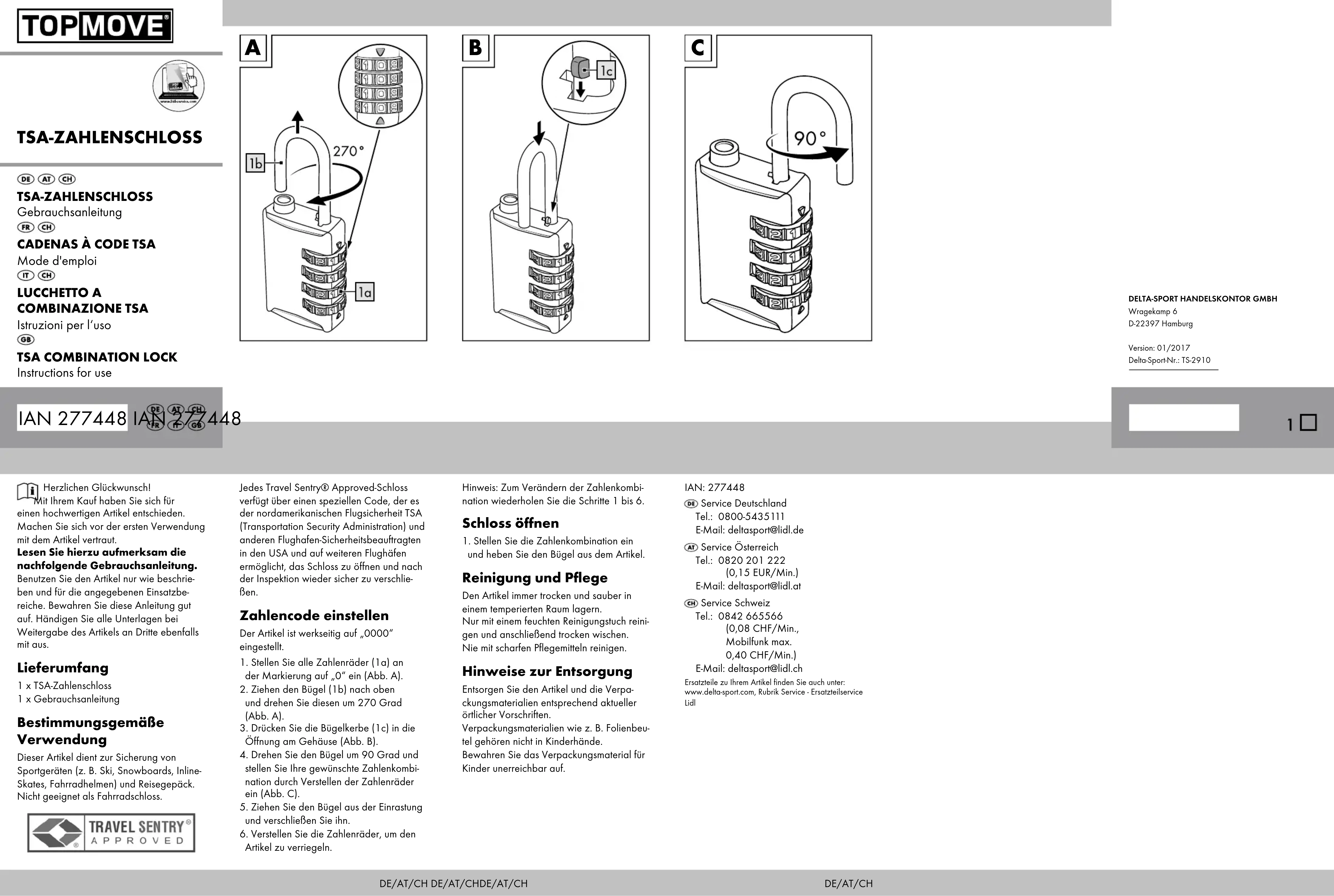 soulevez l'anse de l'article. Nettoyage et entretien Rangez toujours l'article dans une pièce tempérée lorsqu'il est propre et sec. Nettoyer uniquement avec un chiffon humi- de et ensuite essuyer pour sécher. Ne jamais nettoyer avec des nettoyants agressifs ! Mise au rebut Éliminez l‘article et le matériel d‘emballage conformément aux directives locales en vigueur. Le matériel d‘emballage tel que les sachets en plastique par exemple ne doivent pas arriver dans les mains des enfants. Conservez le matériel d‘emballage hors de portée des enfants. Ce produit est recyclable. Il est soumis à la responsabilité élargie du fabricant et est collecté séparément. Informations de garantie Article L211-16 du Code de la con- sommation Lorsque l‘acheteur demande au vendeur, Article 1641 du Code civil Le vendeur est tenu de la garantie à raison des défauts cachés de la chose vendue qui la rendent impropre à l‘usage auquel on la destine, ou qui diminuent tellement cet usa- ge que l‘acheteur ne l‘aurait pas acquise, ou n‘en aurait donné qu‘un moindre prix, s‘il les avait connus. Article 1648 1er alinéa du Code civil L‘action résultant des vices rédhibitoires doit être intentée par l‘acquéreur dans un délai de deux ans à compter de la découverte du vice. Les pièces détachées indispensables à l’utilisation du produit sont disponibles pen- dant la durée de la garantie du produit. IAN : 277448 Service Suisse Tel. : 0842 665566 (0,08 CHF/Min., mobile max. 0,40 CHF/Min.) E-Mail : deltasport@lidl.ch Veuillez trouver les pièces de rechange pour votre produ- it sur : www.delta-sport.com, rubrique Service - Service des pièces de rechange Lidl IT/CH Félicitations ! En faisant cet achat, vous vous êtes décidé pour un article de grande valeur. Familiarisez-vous d‘abord avec l‘article avant de l‘utiliser pour la première fois. Pour cela, veuillez lire attentivement la notice suivante. N‘utilisez cet article que comme décrit dans la notice et que pour les domaines d‘utilisation indiqués. Conservez bien la mode d'emploi. En cas de cession de l‘article à un tiers, remettez-lui tous les documents également. Contenu de la livraison 1 cadenas à code TSA 1 mode d'emploi Utilisation conforme Cet article sert à sécuriser les équipements de sport (p. ex. skis, snowboards, patins en ligne, casques de vélo) et les sacs de voyage. Ne convient pas aux vélos. Chaque cadenas Travel Sentry® Approved dispose d'un code spécial qui permet à la sécurité aérienne nord-américaine TSA (Transportation Security Administration) et à d'autres responsables de la sécurité aé- rienne aux États-Unis et dans de nombreux autres aéroports d'ouvrir le cadenas et de le refermer après inspection. Réglage du code Cet article est réglé par défaut sur « 0000 ».