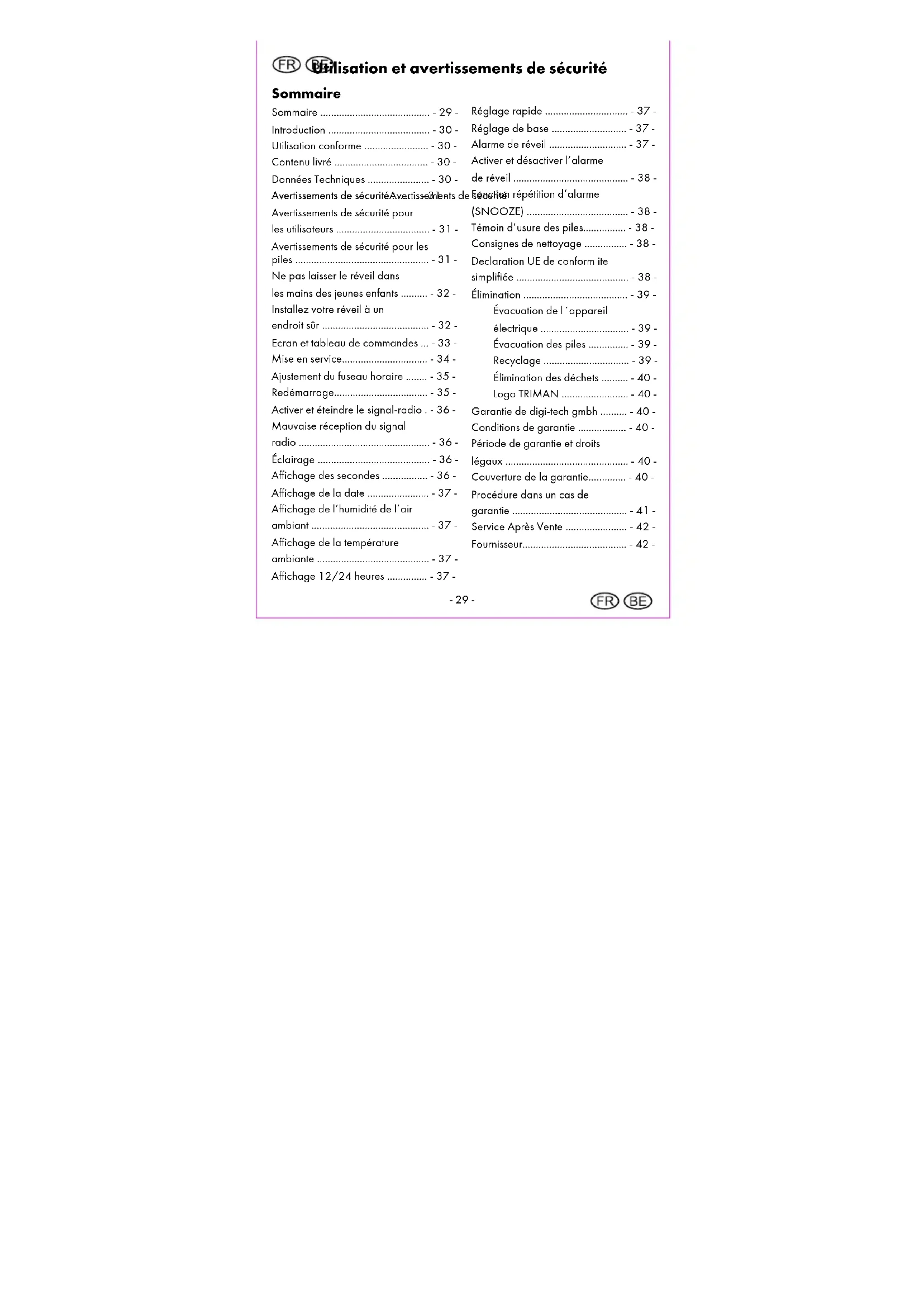 Utilisation et avertissements de sécurité Sommaire Sommaire ......................................... - 29 - Introduction ...................................... - 30 - Utilisation conforme ........................ - 30 - Contenu livré ................................... - 30 - Données Techniques ....................... - 30 - Avertissements de sécurité Avertissements de sécuritéAvertissements de sécurité Avertissements de sécurité .......... - 31 - Avertissements de sécurité pour les utilisateurs ................................... - 31 - Avertissements de sécurité pour les piles .................................................. - 31 - Ne pas laisser le réveil dans les mains des jeunes enfants .......... - 32 - Installez votre réveil à un endroit sûr ........................................ - 32 - Ecran et tableau de commandes ... - 33 - Mise en service................................ - 34 - Ajustement du fuseau horaire ........ - 35 - Redémarrage................................... - 35 - Activer et éteindre le signal-radio . - 36 - Mauvaise réception du signal radio ................................................. - 36 - Éclairage .......................................... - 36 - Affichage des secondes ................. - 36 - Affichage de la date ....................... - 37 - Affichage de l’humidité de l’air ambiant ............................................ - 37 - Affichage de la température ambiante .......................................... - 37 - Affichage 12/24 heures ............... - 37 - Réglage rapide ............................... - 37 - Réglage de base ............................ - 37 - Alarme de réveil ............................. - 37 - Activer et désactiver l’alarme de réveil ........................................... - 38 - Fonction répétition d’alarme (SNOOZE) ...................................... - 38 - Témoin d’usure des piles................ - 38 - Consignes de nettoyage ................ - 38 - Declaration UE de conform ite simplifiée .......................................... - 38 - Élimination ....................................... - 39 - Évacuation de l´appareil électrique ................................. - 39 - Évacuation des piles ............... - 39 - Recyclage ................................ - 39 - Élimination des déchets .......... - 40 - Logo TRIMAN ......................... - 40 - Garantie de digi-tech gmbh .......... - 40 - Conditions de garantie .................. - 40 - Période de garantie et droits légaux .............................................. - 40 - Couverture de la garantie.............. - 40 - Procédure dans un cas de garantie ........................................... - 41 - Service Après Vente ....................... - 42 - Fournisseur....................................... - 42 --