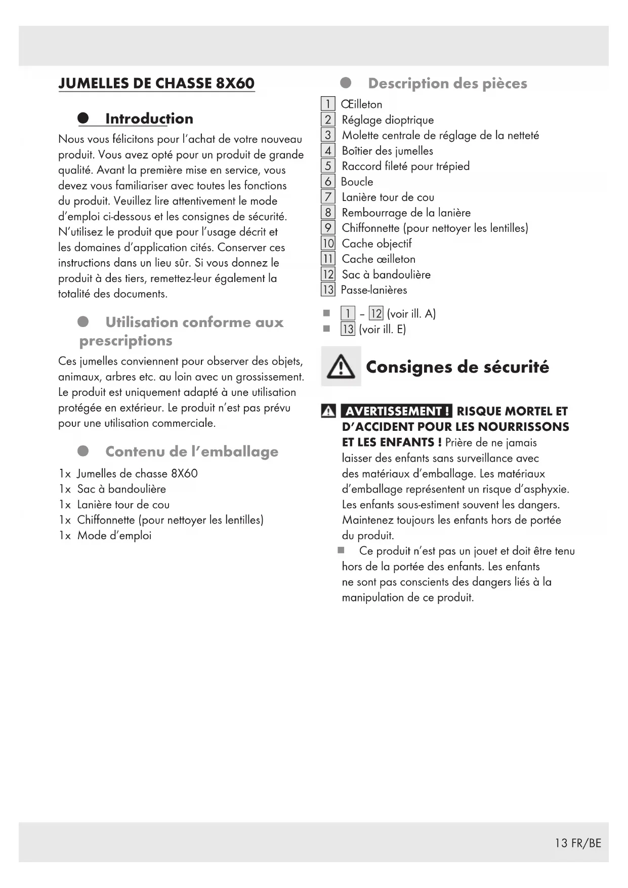 Introduction Nous vous félicitons pour l‘achat de votre nouveau produit. Vous avez opté pour un produit de grande qualité. Avant la première mise en service, vous devez vous familiariser avec toutes les fonctions du produit. Veuillez lire attentivement le mode d’emploi ci-dessous et les consignes de sécurité. N’utilisez le produit que pour l’usage décrit et les domaines d’application cités. Conserver ces instructions dans un lieu sûr. Si vous donnez le produit à des tiers, remettez-leur également la totalité des documents. Utilisation conforme aux prescriptions Ces jumelles conviennent pour observer des objets, animaux, arbres etc. au loin avec un grossissement. Le produit est uniquement adapté à une utilisation protégée en extérieur. Le produit n’est pas prévu pour une utilisation commerciale. Contenu de l’emballage 1x Jumelles de chasse 8X60 1x Sac à bandoulière 1x Lanière tour de cou 1x Chiffonnette (pour nettoyer les lentilles) 1x Mode d’emploi Description des pièces [1] Œilleton [2] Réglage dioptrique [3] Molette centrale de réglage de la netteté [4] Boîtier des jumelles [5] Raccord fileté pour trépied [6] Boucle [7] Lanière tour de cou [8] Rembourrage de la lanière [9] Chiffonnette (pour nettoyer les lentilles) [] Cache objectif [] Cache œilleton [] Sac à bandoulière [] Passe-lanières [1] ‒[] (voir ill. A) [] (voir ill. E) Consignes de sécurité