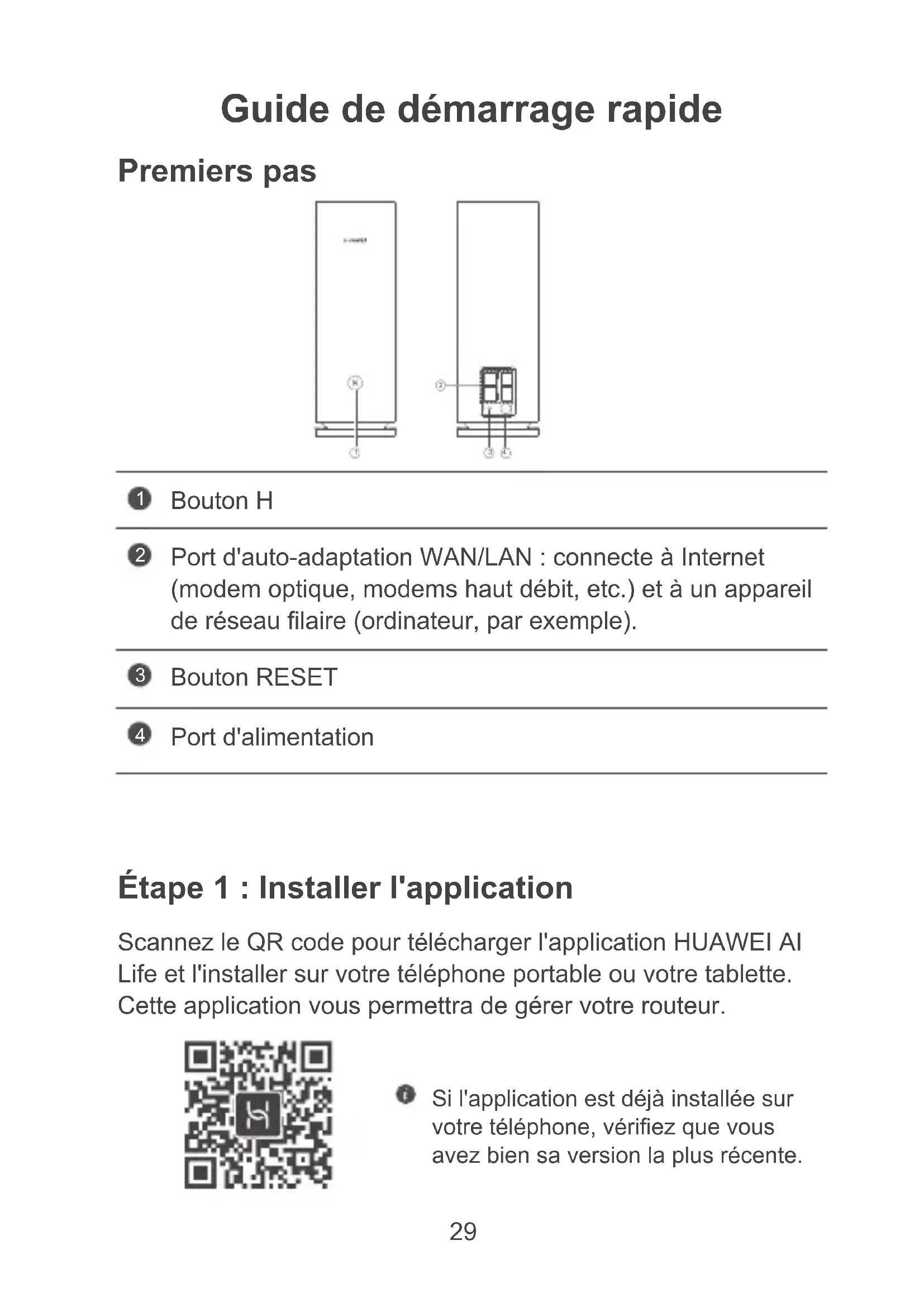 Bouton RESET Port d'auto-adaptation WAN/LAN : connecte à Internet (modem optique, modems haut débit, etc.) et à un appareil de réseau laire (ordinateur, par exemple). Port d'alimentation Bouton H Scannez le QR code pour télécharger l'application HUAWEI AI Life et l'installer sur votre téléphone portable ou votre tablette. Cette application vous permettra de gérer votre routeur. Étape 1 : Installer l'application Si l'application est déjà installée sur votre téléphone, vériez que vous avez bien sa version la plus récente.