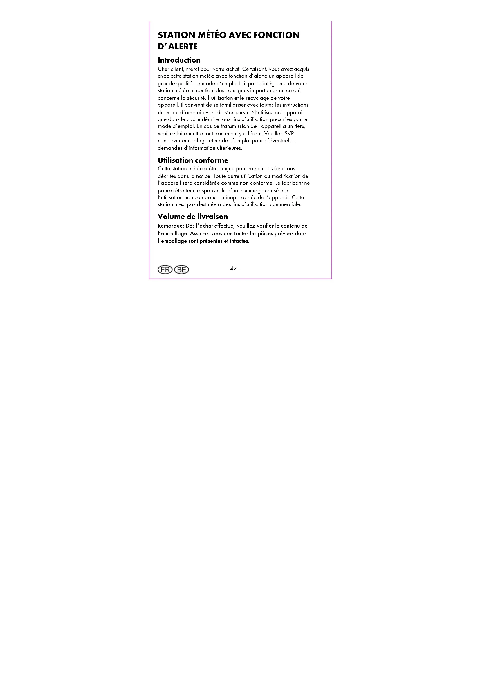 D’ALERTE Introduction Cher client, merci pour votre achat. Ce faisant, vous avez acquis avec cette station météo avec fonction d’alerte un appareil de grande qualité. Le mode d’emploi fait partie intégrante de votre station météo et contient des consignes importantes en ce qui concerne la sécurité, l’utilisation et le recyclage de votre appareil. Il convient de se familiariser avec toutes les instructions du mode d’emploi avant de s’en servir. N’utilisez cet appareil que dans le cadre décrit et aux fins d’utilisation prescrites par le mode d’emploi. En cas de transmission de l’appareil à un tiers, veuillez lui remettre tout document y afférant. Veuillez SVP conserver emballage et mode d’emploi pour d’éventuelles demandes d’information ultérieures. Utilisation conforme Cette station météo a été conçue pour remplir les fonctions décrites dans la notice. Toute autre utilisation ou modification de l’appareil sera considérée comme non conforme. Le fabricant ne pourra être tenu responsable d’un dommage causé par l’utilisation non conforme ou inappropriée de l’appareil. Cette station n’est pas destinée à des fins d’utilisation commerciale. Volume de livraison Remarque: Dès l’achat effectué, veuillez vérifier le contenu de l’emballage. Assurez-vous que toutes les pièces prévues dans l’emballage sont présentes et intactes.- 43 -