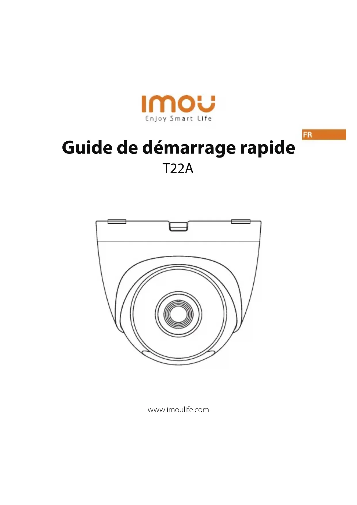 - L luz infrarroja se refleja en la lente, por lo que el efecto no es bueno. Ajuste el ángulo de la lente para evitar oclusiones alrededor de la lente. Solución de problemas Problema SoluciónT22A Guide de démarrage rapide www.imoulife.comBienvenue Merci d’avoir choisi IMOU. Nous nous consacrons à fournir des produits pour la maison intelligente plus faciles à utiliser. Si vous rencontrez des dicultés lors de l’utilisation du produit, veuillez contacter notre équipe technique avant de renvoyer votre produit. Notre courriel de service:service.global@imoulife.com Nous nous engageons à vous répondre dans les 24heures. Les questions les plus fréquemment posées peuvent être consultées sur le site imoulife.com/support/helpPaquet de vis×1 Contenu de l’emballage Introduction à la caméra Caméra×1 Guide de démarrage rapide×1 Objectif LED IR Patron d’installation ×1Mounting Plate ×1Scène1: Scène2: Routeur Routeur Câble Câble NVR Moniteur Camera Camera Smart phone Commutateur PoE1 Windows Imou Life Setup WIFI NamePassword Next Setup Done 2Vis autotaraudeuse