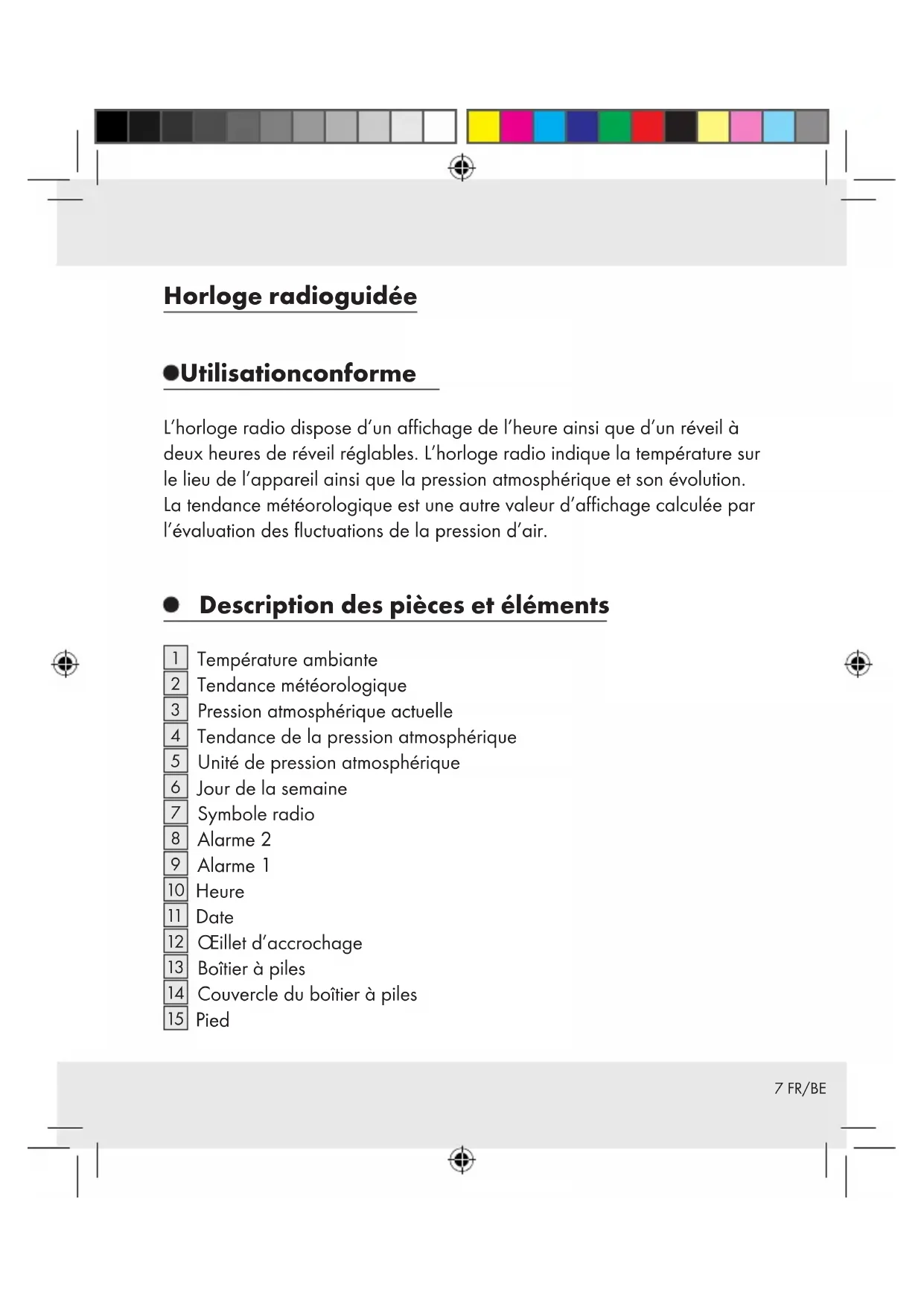 1 Température ambiante 2 Tendance météorologique 3 Pression atmosphérique actuelle 4 Tendance de la pression atmosphérique 5 Unité de pression atmosphérique 6 Jour de la semaine 7 Symbole radio 8 Alarme 2 9 Alarme 1 10 Heure Date 12 Ceinture d'accrochage 13 Boîtier à piles 14 Couvercle du boîtier à piles 15 Pied