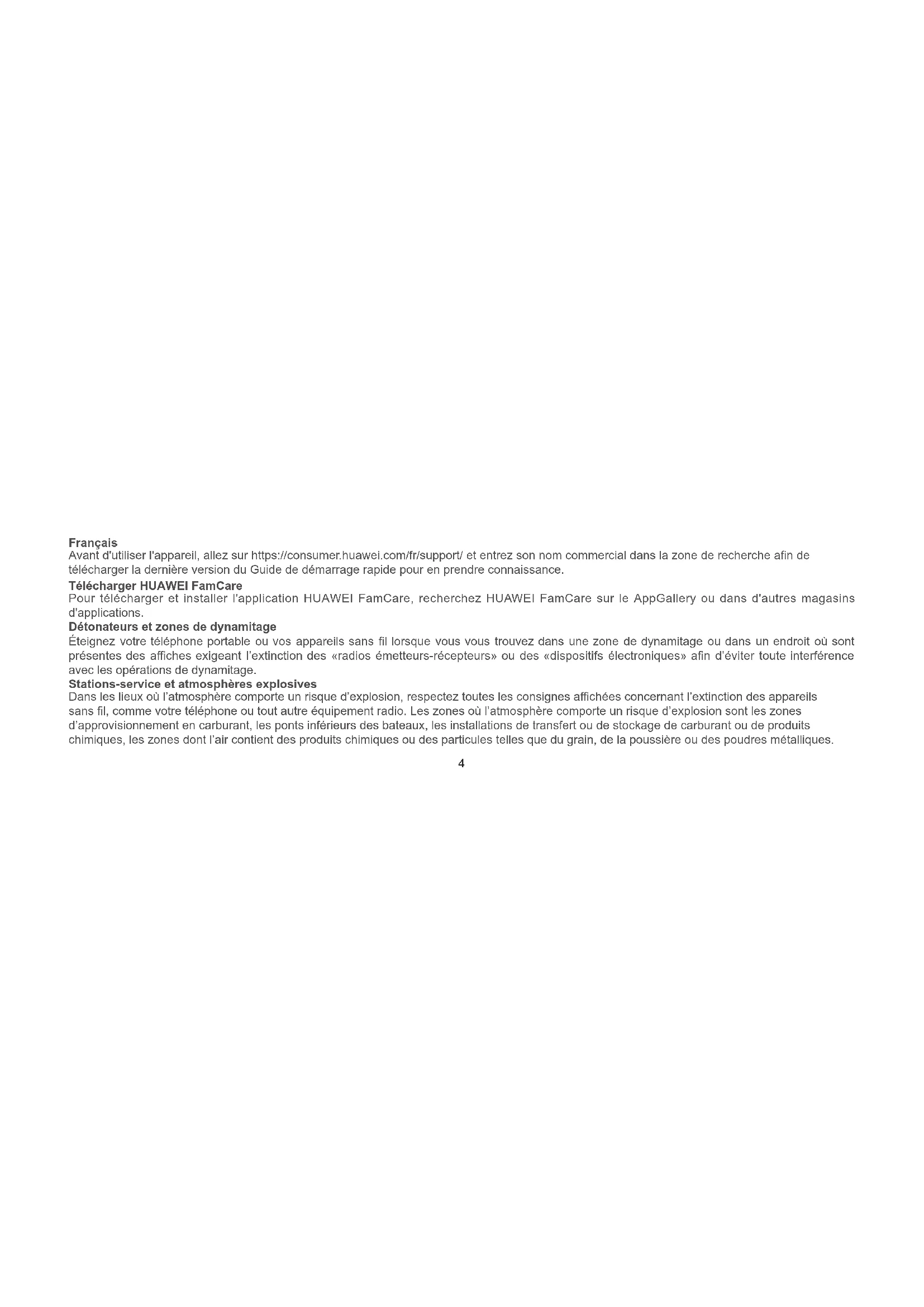 - Précautions à prendre par les porteurs d'implants électroniques (stimulateurs cardiaques, pompes à insuline, neurostimulateurs…) concernant notamment la distance entre l'équipement radioélectrique et l'implant (15 centimètres dans le cas des sources d'exposition les plus fortes comme les téléphones mobiles).7 Consignes de mise au rebut et de recyclage Le symbole sur le produit, la batterie, la documentation ou l'emballage indique que les produits et les batteries doivent être placés dans des points de collecte de déchets distincts désignés par les autorités locales à la n de leur durée de vie. De la sorte, les déchets EEE seront recyclés et traités de manière à préserver des matériaux précieux et à protéger la santé humaine et l'environnement. Pour en savoir plus sur les lieux de collecte et la manière de mettre au rebut vos déchets électriques et électroniques, contactez les autorités locales, votre détaillant ou le service des ordures ménagères, ou rendez-vous sur le site https://consumer.huawei.com. Conformité réglementaire UE Par la présente, Huawei Device Co., Ltd. déclare que cet appareil ASN-AL10 est conforme à la directive suivante: 2014/53/UE. Le texte intégral de la déclaration de conformité UE, les informations détaillées les informations les plus récentes sur les accessoires et logiciels sont disponibles à l'adresse Internet suivante : https://consumer.huawei.com/certication. Exigences RF en matière d'exposition Conformément aux recommandations des directives internationales, l’appareil est conçu de manière à ne pas dépasser les limites d’exposition aux ondes radio établies par la Commission européenne. Le DAS maximal autorisé est de 2,0 W/kg pour la tête et le tronc et de 4,0 W/kg pour les membres. L'appareil est conforme aux spécications RF lorsqu' il est porté au poignet ou à 1,0 cm du visage ou à une distance de 0,50 cm du corps.8 Valeur DAS la plus élevée rapportée: DAS à la tête: 1,03 W / kg; DAS aux membres: 1,67 W / kg; DAS au corps : 1,28 W/kg. Bandes de fréquences et alimentation Les bandes de fréquences sur lesquelles fonctionne l'équipement radiotéléphonique : Certaines bandes ne sont pas disponibles dans tous les pays ou dans toutes les régions. Pour plus d'informations, veuillez contacter votre opérateur local. GSM900: 35.5 dBm, GSM1800: 32.5 dBm, WCDMA900/2100: 25.7 dBm, LTE Band 1/3/7/8/20/28/34/38/40: 25.7 dBm, Wi-Fi 2.4G: 20 dBm, Bluetooth 2.4G: 13 dBm Sur l’appareil, allez à Paramètres > Info appareil > Informations règlementaires (Watch-Settings > Device Info > Supervision Info) pour visualiser l’étiquette électronique. Español Antes de usar el dispositivo, visite https://consumer.huawei.com/latin/support/ e ingrese el nombre comercial en el cuadro de búsqueda para leer y descargar la versión más reciente de la Guía de inicio rápido. Cómo descargar HUAWEI FamCare Para descargar e instalar la aplicación HUAWEI FamCare, busque la aplicación en AppGallery o en otras tiendas de aplicaciones. Operación y seguridad