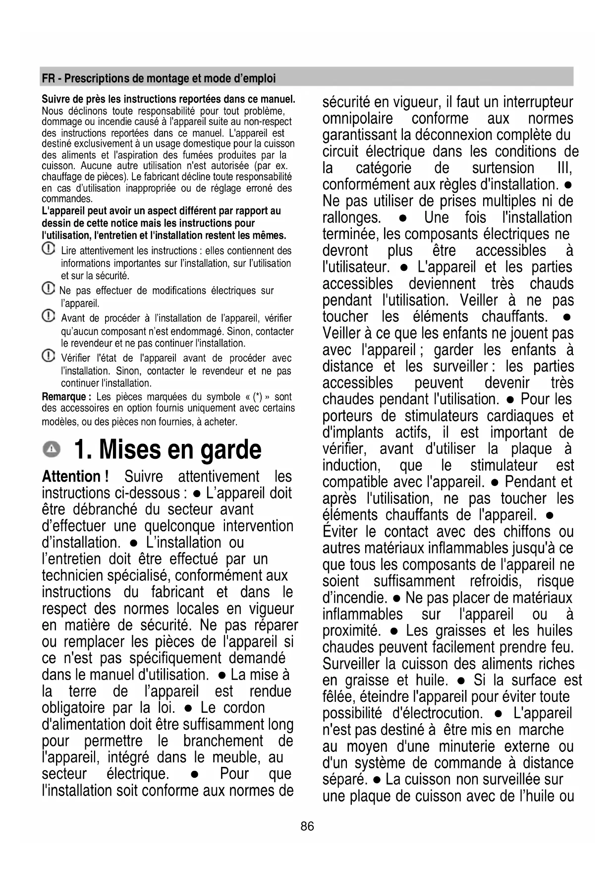 Attention ! Suivre attentivement les instructions ci-dessous : ● L’appareil doit être débranché du secteur avant d’effectuer une quelconque intervention d’installation. ● L’installation ou l’entretien doit être effectué par un technicien spécialisé, conformément aux instructions du fabricant et dans le respect des normes locales en vigueur en matière de sécurité. Ne pas réparer ou remplacer les pièces de l'appareil si ce n'est pas spécifiquement demandé dans le manuel d'utilisation. ● La mise à la terre de l’appareil est rendue obligatoire par la loi. ● Le cordon d'alimentation doit être suffisamment long pour permettre le branchement de l'appareil, intégré dans le meuble, au secteur électrique. ● Pour que l'installation soit conforme aux normes de sécurité en vigueur, il faut un interrupteur omnipolaire conforme aux normes garantissant la déconnexion complète du circuit électrique dans les conditions de la catégorie de surtension III, conformément aux règles d'installation. ● Ne pas utiliser de prises multiples ni de rallonges. ● Une fois l'installation terminée, les composants électriques ne devront plus être accessibles à l'utilisateur. ● L'appareil et les parties accessibles deviennent très chauds pendant l'utilisation. Veiller à ne pas toucher les éléments chauffants. ● Veiller à ce que les enfants ne jouent pas avec l'appareil ; garder les enfants à distance et les surveiller : les parties accessibles peuvent devenir très chaudes pendant l'utilisation. ● Pour les porteurs de stimulateurs cardiaques et d'implants actifs, il est important de vérifier, avant d'utiliser la plaque à induction, que le stimulateur est compatible avec l'appareil. ● Pendant et après l'utilisation, ne pas toucher les éléments chauffants de l'appareil. ● Éviter le contact avec des chiffons ou autres matériaux inflammables jusqu'à ce que tous les composants de l'appareil ne soient suffisamment refroidis, risque d’incendie. ● Ne pas placer de matériaux inflammables sur l'appareil ou à proximité. ● Les graisses et les huiles chaudes peuvent facilement prendre feu. Surveiller la cuisson des aliments riches en graisse et huile. ● Si la surface est fêlée, éteindre l'appareil pour éviter toute possibilité d'électrocution. ● L'appareil n'est pas destiné à être mis en marche au moyen d'une minuterie externe ou d'un système de commande à distance séparé. ● La cuisson non surveillée sur une plaque de cuisson avec de l’huile ou87 de la graisse peut être dangereuse et provoquer des incendies. ● Le processus de cuisson doit être surveillé. Un processus de cuisson à court terme doit être surveillé en permanence. ● Ne JAMAIS essayer d'éteindre les flammes avec de l'eau. Éteindre l'appareil et étouffer les flammes, par exemple avec un couvercle ou une couverture anti-feu. Risque d'incendie : ne pas placer d'objets sur les surfaces de cuisson. ● Ne pas utiliser de nettoyeur vapeur, risque d'électrocution. ● Ne pas poser d’objets métalliques tels que des couteaux, des fourchettes, des cuillères et des couvercles sur la surface de la plaque de cuisson car ils pourraient surchauffer. ● Avant de brancher l’appareil au secteur électrique : contrôler la plaque des données (placée sur la partie inférieure de l’appareil) pour vérifier que la tension et la puissance correspondent à celle du secteur et que la prise est adéquate. En cas de doute, appeler un électricien qualifié. Important : ● Après utilisation, éteindre la plaque de cuisson au moyen du dispositif de commande et ne pas se fier uniquement au détecteur de casseroles. ● Éviter de renverser du liquide ; pour faire bouillir ou chauffer des liquides, réduire l'apport de chaleur. ● Ne pas laisser les éléments chauffants allumés avec des casseroles et des poêles vides, ou encore sans récipients. ● À la fin de la cuisson, éteindre la zone de cuisson correspondante. ● Pour la cuisson, ne jamais utiliser de papier aluminium, et ne jamais poser directement des produits emballés en aluminium. L'aluminium fondrait et endommagerait irrémédiablement votre appareil. ● Ne jamais chauffer une boîte ou une boîte de conserve contenant des aliments sans l'ouvrir : elle pourrait exploser ! Cette mise en garde vaut pour tous les autres types de plaques de cuisson. ● L'utilisation d'une puissance élevée comme la fonction Booster ne convient pas pour le chauffage de liquides tel que l'huile de friture. Une chaleur excessive pourrait être dangereuse. Dans ces cas, il est recommandé d'utiliser une puissance inférieure. ● Les récipients doivent être directement placés sur la plaque de cuisson et être centrés. N'insérer en aucun cas d’autres objets entre la casserole et la plaque de cuisson. ● En cas de températures élevées, l'appareil réduit automatiquement le niveau de puissance des zones de cuisson. ● Avant toute opération de nettoyage ou d'entretien, débrancher l’appareil du réseau électrique en retirant la fiche électrique ou en coupant l'interrupteur général. ● Utiliser des gants de travail pour toutes les opérations d'installation et d'entretien. ● L'appareil peut être utilisé par des enfants de plus de 8 ans et par des personnes aux capacités physiques, sensorielles ou mentales réduites, ou sans l'expérience ni les connaissances nécessaires, à condition d'être surveillés ou d'avoir reçu les instructions relatives à l'utilisation sûre de l'appareil et à la compréhension des risques inhérents. ● Les enfants doivent être contrôlés pour s'assurer qu'ils ne jouent pas avec l'appareil. ● Le nettoyage et l'entretien ne doivent pas être effectués par des enfants sans surveillance. ● La pièce doit être suffisamment aérée quand l’appareil est utilisé simultanément aux autres appareils de combustion au gaz ou autres combustibles. ● L’appareil doit êt