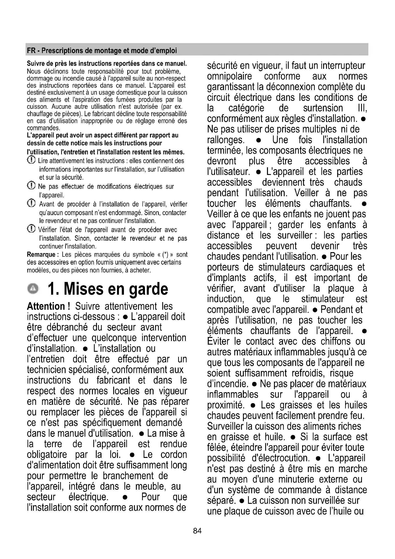 Attention ! Suivre attentivement les instructions ci-dessous : ● L’appareil doit être débranché du secteur avant d’effectuer une quelconque intervention d’installation. ● L’installation ou l’entretien doit être effectué par un technicien spécialisé, conformément aux instructions du fabricant et dans le respect des normes locales en vigueur en matière de sécurité. Ne pas réparer ou remplacer les pièces de l'appareil si ce n'est pas spécifiquement demandé dans le manuel d'utilisation. ● La mise à la terre de l’appareil est rendue obligatoire par la loi. ● Le cordon d'alimentation doit être suffisamment long pour permettre le branchement de l'appareil, intégré dans le meuble, au secteur électrique. ● Pour que l'installation soit conforme aux normes de sécurité en vigueur, il faut un interrupteur omnipolaire conforme aux normes garantissant la déconnexion complète du circuit électrique dans les conditions de la catégorie de surtension III, conformément aux règles d'installation. ● Ne pas utiliser de prises multiples ni de rallonges. ● Une fois l'installation terminée, les composants électriques ne devront plus être accessibles à l'utilisateur. ● L'appareil et les parties accessibles deviennent très chauds pendant l'utilisation. Veiller à ne pas toucher les éléments chauffants. ● Veiller à ce que les enfants ne jouent pas avec l'appareil ; garder les enfants à distance et les surveiller : les parties accessibles peuvent devenir très chaudes pendant l'utilisation. ● Pour les porteurs de stimulateurs cardiaques et d'implants actifs, il est important de vérifier, avant d'utiliser la plaque à induction, que le stimulateur est compatible avec l'appareil. ● Pendant et après l'utilisation, ne pas toucher les éléments chauffants de l'appareil. ● Éviter le contact avec des chiffons ou autres matériaux inflammables jusqu'à ce que tous les composants de l'appareil ne soient suffisamment refroidis, risque d’incendie. ● Ne pas placer de matériaux inflammables sur l'appareil ou à proximité. ● Les graisses et les huiles chaudes peuvent facilement prendre feu. Surveiller la cuisson des aliments riches en graisse et huile. ● Si la surface est fêlée, éteindre l'appareil pour éviter toute possibilité d'électrocution. ● L'appareil n'est pas destiné à être mis en marche au moyen d'une minuterie externe ou d'un système de commande à distance séparé. ● La cuisson non surveillée sur une plaque de cuisson avec de l’huile ou85 de la graisse peut être dangereuse et provoquer des incendies. ● Le processus de cuisson doit être surveillé. Un processus de cuisson à court terme doit être surveillé en permanence. ● Ne JAMAIS essayer d'éteindre les flammes avec de l'eau. Éteindre l'appareil et étouffer les flammes, par exemple avec un couvercle ou une couverture anti-feu. Risque d'incendie : ne pas placer d'objets sur les surfaces de cuisson. ● Ne pas utiliser de nettoyeur vapeur, risque d'électrocution. ● Ne pas poser d’objets métalliques tels que des couteaux, des fourchettes, des cuillères et des couvercles sur la surface de la plaque de cuisson car ils pourraient surchauffer. ● Avant de brancher l’appareil au secteur électrique : contrôler la plaque des données (placée sur la partie inférieure de l’appareil) pour vérifier que la tension et la puissance correspondent à celle du secteur et que la prise est adéquate. En cas de doute, appeler un électricien qualifié. Important : ● Après utilisation, éteindre la plaque de cuisson au moyen du dispositif de commande et ne pas se fier uniquement au détecteur de casseroles. ● Éviter de renverser du liquide ; pour faire bouillir ou chauffer des liquides, réduire l'apport de chaleur. ● Ne pas laisser les éléments chauffants allumés avec des casseroles et des poêles vides, ou encore sans récipients. ● À la fin de la cuisson, éteindre la zone de cuisson correspondante. ● Pour la cuisson, ne jamais utiliser de papier aluminium, et ne jamais poser directement des produits emballés en aluminium. L'aluminium fondrait et endommagerait irrémédiablement votre appareil. ● Ne jamais chauffer une boîte ou une boîte de conserve contenant des aliments sans l'ouvrir : elle pourrait exploser ! Cette mise en garde vaut pour tous les autres types de plaques de cuisson. ● L'utilisation d'une puissance élevée comme la fonction Booster ne convient pas pour le chauffage de liquides tel que l'huile de friture. Une chaleur excessive pourrait être dangereuse. Dans ces cas, il est recommandé d'utiliser une puissance inférieure. ● Les récipients doivent être directement placés sur la plaque de cuisson et être centrés. N'insérer en aucun cas d’autres objets entre la casserole et la plaque de cuisson. ● En cas de températures élevées, l'appareil réduit automatiquement le niveau de puissance des zones de cuisson. ● Avant toute opération de nettoyage ou d'entretien, débrancher l’appareil du réseau électrique en retirant la fiche électrique ou en coupant l'interrupteur général. ● Utiliser des gants de travail pour toutes les opérations d'installation et d'entretien. ● L'appareil peut être utilisé par des enfants de plus de 8 ans et par des personnes aux capacités physiques, sensorielles ou mentales réduites, ou sans l'expérience ni les connaissances nécessaires, à condition d'être surveillés ou d'avoir reçu les instructions relatives à l'utilisation sûre de l'appareil et à la compréhension des risques inhérents. ● Les enfants doivent être contrôlés pour s'assurer qu'ils ne jouent pas avec l'appareil. ● Le nettoyage et l'entretien ne doivent pas être effectués par des enfants sans surveillance. ● La pièce doit être suffisamment aérée quand l’appareil est utilisé simultanément aux autres appareils de combustion au gaz ou autres combustibles. ● L’appareil doit êt