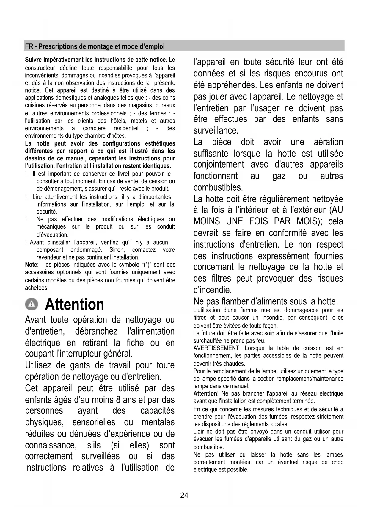 (Schnappverschluss). Sollte die Beleuchtung nicht funktionieren, erst kontrollieren, ob die Lampen einwandfrei eingesetzt sind, bevor man sich an den Kundendienst wendet. - Modell mit LED lampen Die Haube ist mit einem auf der Leuchtdiodentechnologie basierten Beleuchtungssystem ausgestattet. Die LEDs ermöglichen eine optimale Beleuchtung der Kochfläche. Sie haben eine Leistungsdauer, die das Zehnfache deren der traditionellen Lichter ist und bieten eine Energieersparnis bis zu 90%. Um die Leds mit neuen zu ersetzen, setzen Sie sich bitte mit dem Kundendienst in Verbindung.24 FR - Prescriptions de montage et mode d’emploi Suivre impérativement les instructions de cette notice. Le constructeur décline toute responsabilité pour tous les inconvénients, dommages ou incendies provoqués à l’appareil et dûs à la non observation des instructions de la présente notice. Cet appareil est destiné à être utilisé dans des applications domestiques et analogues telles que : - des coins cuisines réservés au personnel dans des magasins, bureaux et autres environnements professionnels ; - des fermes ; - l’utilisation par les clients des hôtels, motels et autres environnements à caractère résidentiel ; - des environnements du type chambre d’hôtes. La hotte peut avoir des configurations esthétiques différentes par rapport à ce qui est illustré dans les dessins de ce manuel, cependant les instructions pour l’utilisation, l’entretien et l’installation restent identiques. ! Il est important de conserver ce livret pour pouvoir le consulter à tout moment. En cas de vente, de cession ou de déménagement, s’assurer qu’il reste avec le produit. ! Lire attentivement les instructions: il y a d’importantes informations sur l’installation, sur l’emploi et sur la sécurité. ! Ne pas effectuer des modifications électriques ou mécaniques sur le produit ou sur les conduit d’évacuation. ! Avant d'installer l'appareil, vérifiez qu’il n’y a aucun composant endommagé. Sinon, contactez votre revendeur et ne pas continuer l'installation. Note: les pièces indiquées avec le symbole “(*)” sont des accessoires optionnels qui sont fournies uniquement avec certains modèles ou des pièces non fournies qui doivent être achetées. Attention Avant toute opération de nettoyage ou d'entretien, débranchez l'alimentation électrique en retirant la fiche ou en coupant l'interrupteur général. Utilisez de gants de travail pour toute opération de nettoyage ou d'entretien. Cet appareil peut être utilisé par des enfants âgés d’au moins 8 ans et par des personnes ayant des capacités physiques, sensorielles ou mentales réduites ou dénuées d’expérience ou de connaissance, s’ils (si elles) sont correctement surveillées ou si des instructions relatives à l’utilisation de l’appareil en toute sécurité leur ont été données et si les risques encourus ont été appréhendés. Les enfants ne doivent pas jouer avec l’appareil. Le nettoyage et l’entretien par l’usager ne doivent pas être effectués par des enfants sans surveillance. La pièce doit avoir une aération suffisante lorsque la hotte est utilisée conjointement avec d'autres appareils fonctionnant au gaz ou autres combustibles. La hotte doit être régulièrement nettoyée à la fois à l'intérieur et à l'extérieur (AU MOINS UNE FOIS PAR MOIS); cela devrait se faire en conformité avec les instructions d'entretien. Le non respect des instructions expressément fournies concernant le nettoyage de la hotte et des filtres peut provoquer des risques d'incendie. Ne pas flamber d’aliments sous la hotte. L'utilisation d'une flamme nue est dommageable pour les filtres et peut causer un incendie, par conséquent, elles doivent être évitées de toute façon. La friture doit être faite avec soin afin de s’assurer que l’huile surchauffée ne prend pas feu.