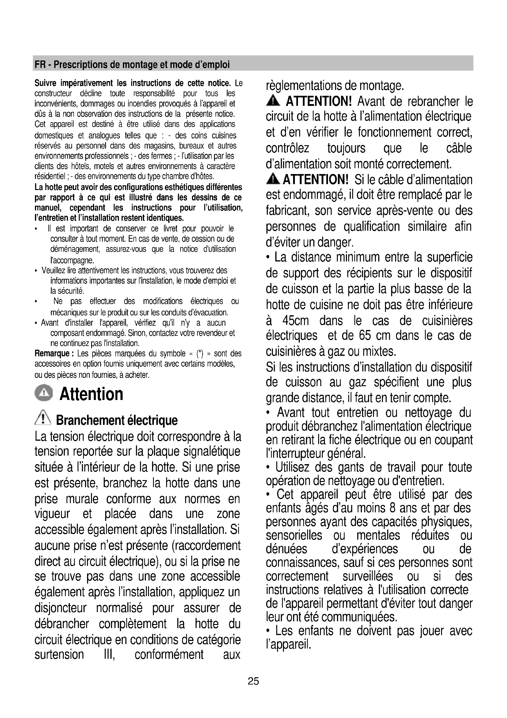 - Avant d'installer l'appareil, vérifiez qu’il n’y a aucun composant endommagé. Sinon, contactez votre revendeur et ne continuez pas l'installation. Remarque : Les pièces marquées du symbole « (*) » sont des accessoires en option fournis uniquement avec certains modèles, ou des pièces non fournies, à acheter. Attention Branchement électrique La tension électrique doit correspondre à la tension reportée sur la plaque signalétique située à l’intérieur de la hotte. Si une prise est présente, branchez la hotte dans une prise murale conforme aux normes en vigueur et placée dans une zone accessible également après l’installation. Si aucune prise n’est présente (raccordement direct au circuit électrique), ou si la prise ne se trouve pas dans une zone accessible également après l’installation, appliquez un disjoncteur normalisé pour assurer de débrancher complètement la hotte du circuit électrique en conditions de catégorie surtension III, conformément aux règlementations de montage. ATTENTION! Avant de rebrancher le circuit de la hotte à l’alimentation électrique et d’en vérifier le fonctionnement correct, contrôlez toujours que le câble d’alimentation soit monté correctement. ATTENTION! Si le câble d’alimentation est endommagé, il doit être remplacé par le fabricant, son service après-vente ou des personnes de qualification similaire afin d’éviter un danger.