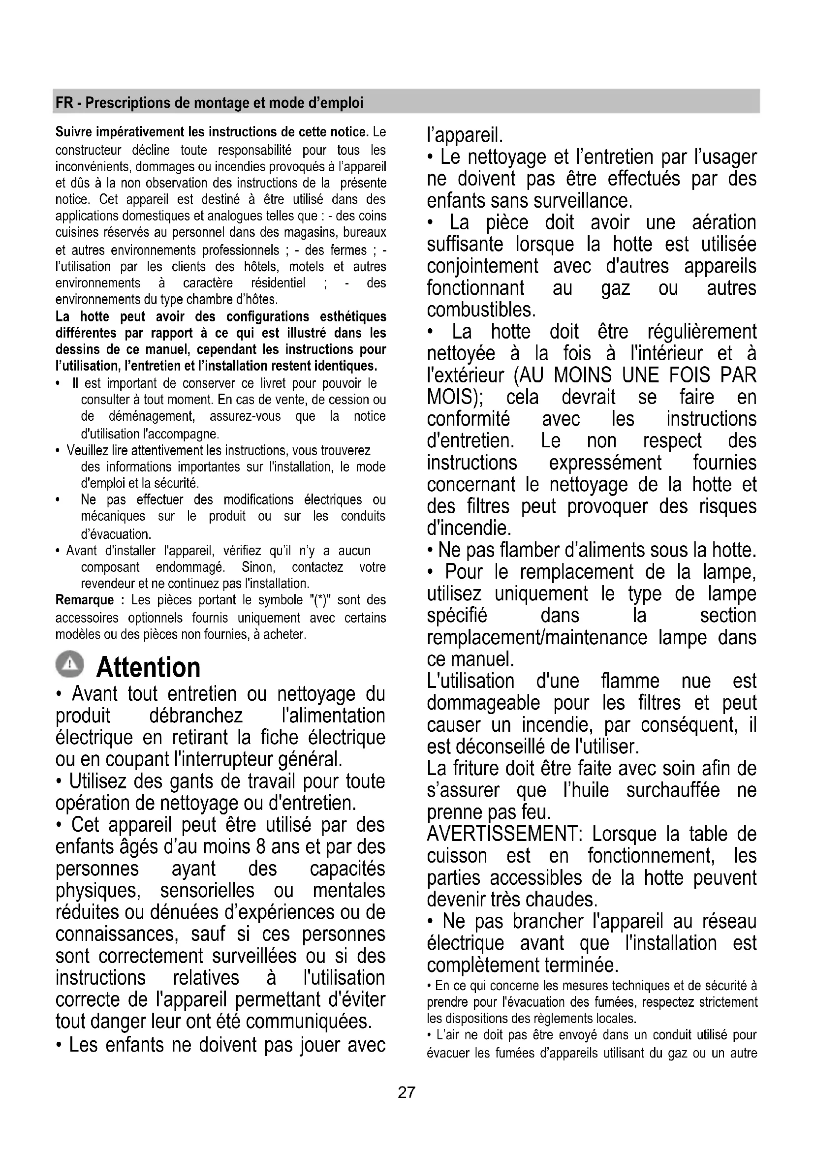 - La hotte ne doit JAMAIS être utilisée comme une surface d'appui, sauf indication expresse.
