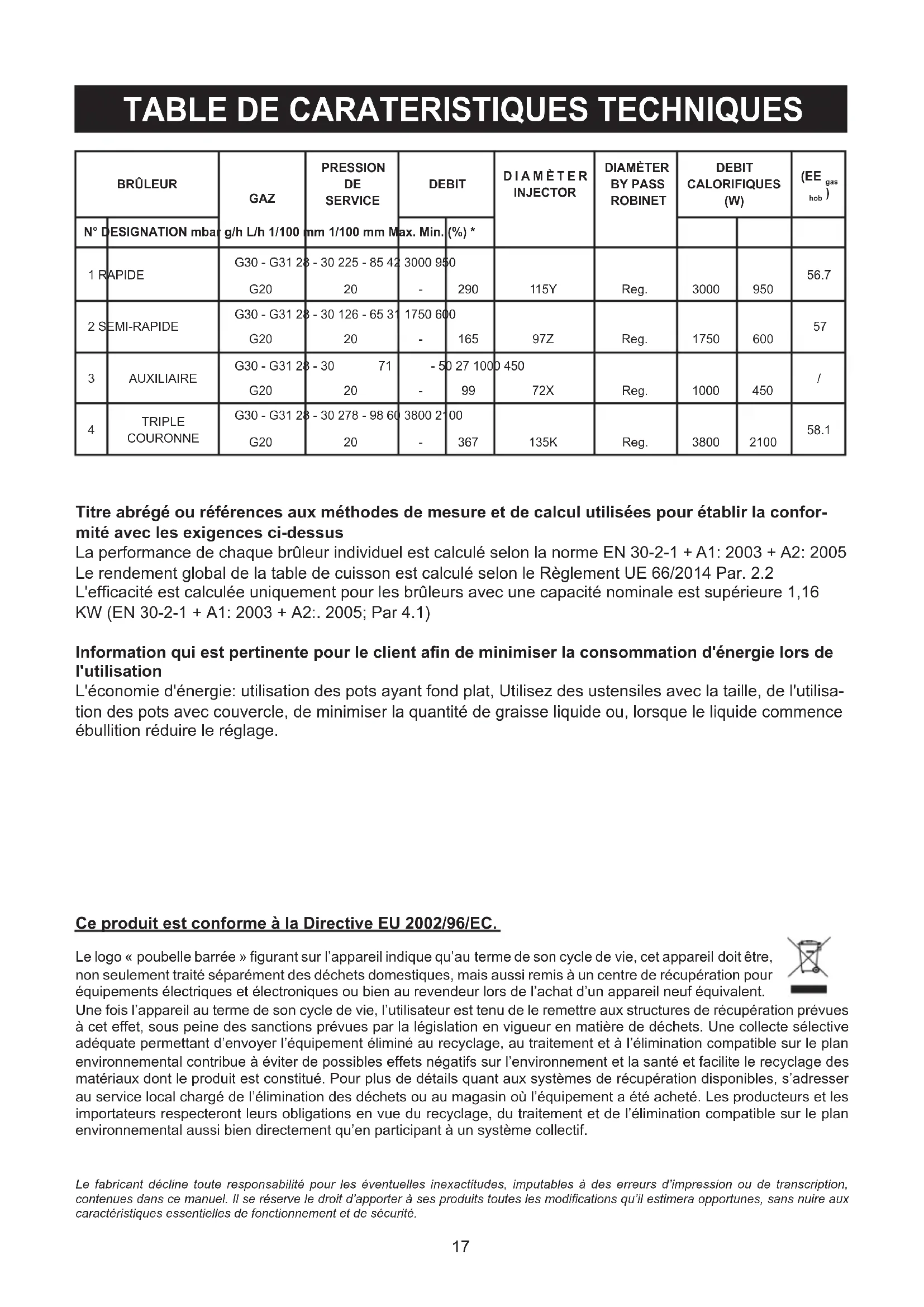 G20 20 - 367 135K Reg. 3800 2100 Ce produit est conforme à la Directive EU 2002/96/EC. Le logo « poubelle barrée » gurant sur l’appareil indique qu’au terme de son cycle de vie, cet appareil doit être, non seulement traité séparément des déchets domestiques, mais aussi remis à un centre de récupération pour équipements électriques et électroniques ou bien au revendeur lors de l’achat d’un appareil neuf équivalent. Une fois l’appareil au terme de son cycle de vie, l’utilisateur est tenu de le remettre aux structures de récupération prévues à cet effet, sous peine des sanctions prévues par la législation en vigueur en matière de déchets. Une collecte sélective adéquate permettant d’envoyer l’équipement éliminé au recyclage, au traitement et à l’élimination compatible sur le plan environnemental contribue à éviter de possibles effets négatifs sur l’environnement et la santé et facilite le recyclage des matériaux dont le produit est constitué. Pour plus de détails quant aux systèmes de récupération disponibles, s’adresser au service local chargé de l’élimination des déchets ou au magasin où l’équipement a été acheté. Les producteurs et les importateurs respecteront leurs obligations en vue du recyclage, du traitement et de l’élimination compatible sur le plan environnemental aussi bien directement qu’en participant à un système collectif. Le fabricant décline toute responsabilité pour les éventuelles inexactitudes, imputables à des erreurs d’impression ou de transcription, contenues dans ce manuel. Il se réserve le droit d’apporter à ses produits toutes les modifications qu’il estimera opportunes, sans nuire aux caractéristiques essentielles de fonctionnement et de sécurité. Titre abrégé ou références aux méthodes de mesure et de calcul utilisées pour établir la confor- mité avec les exigences ci-dessus La performance de chaque brûleur individuel est calculé selon la norme EN 30-2-1 + A1: 2003 + A2: 2005 Le rendement global de la table de cuisson est calculé selon le Règlement UE 66/2014 Par. 2.2 L'efcacité est calculée uniquement pour les brûleurs avec une capacité nominale est supérieure 1,16 KW (EN 30-2-1 + A1: 2003 + A2:. 2005; Par 4.1) Information qui est pertinente pour le client an de minimiser la consommation d'énergie lors de l'utilisation L'économie d'énergie: utilisation des pots ayant fond plat, Utilisez des ustensiles avec la taille, de l'utilisa- tion des pots avec couvercle, de minimiser la quantité de graisse liquide ou, lorsque le liquide commence ébullition réduire le réglage.18