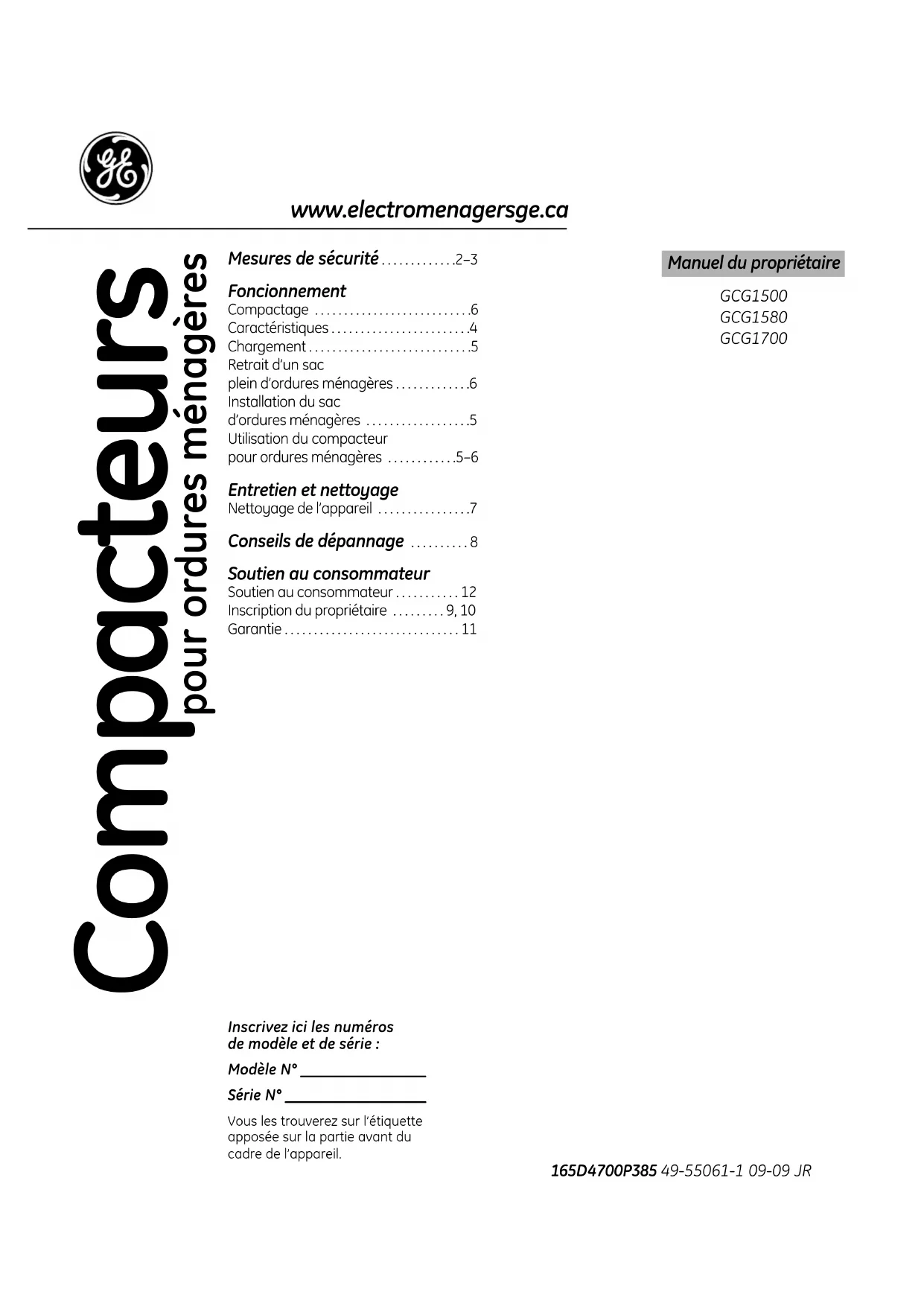 - , 10Garantie www.electromenagersge.ca GCG1500 GCG1580 GCG1700 165D4700P385 49-55061-1 09-09 JR Inscrivez ici les numéros de modèle et de série :Modèle N° ________________Série N° __________________Vous les trouverez sur l’étiquetteapposée sur la partie avant ducadre de l’appareil. Compacteurs Manuel du propriétaire pour ordures ménagèresMESURES DE SÉCURITÉ IMPORTANTES. LISEZ D’ABORD TOUTES LES DIRECTIVES. AVERTISSEMENT ! Pour votre sécurité, vous devez suivre l’information contenue dans ce manuel pour réduire les risques d’incendie, d’explosion, de choc électrique ou pour éviter tout dommage matériel, des blessures ou la mort. Ce compacteur est réservé à l’utilisation résidentielle. Utilisez cet appareil seulement pour l’usage auquel il est destiné selon ce manuel du propriétaire p. 11