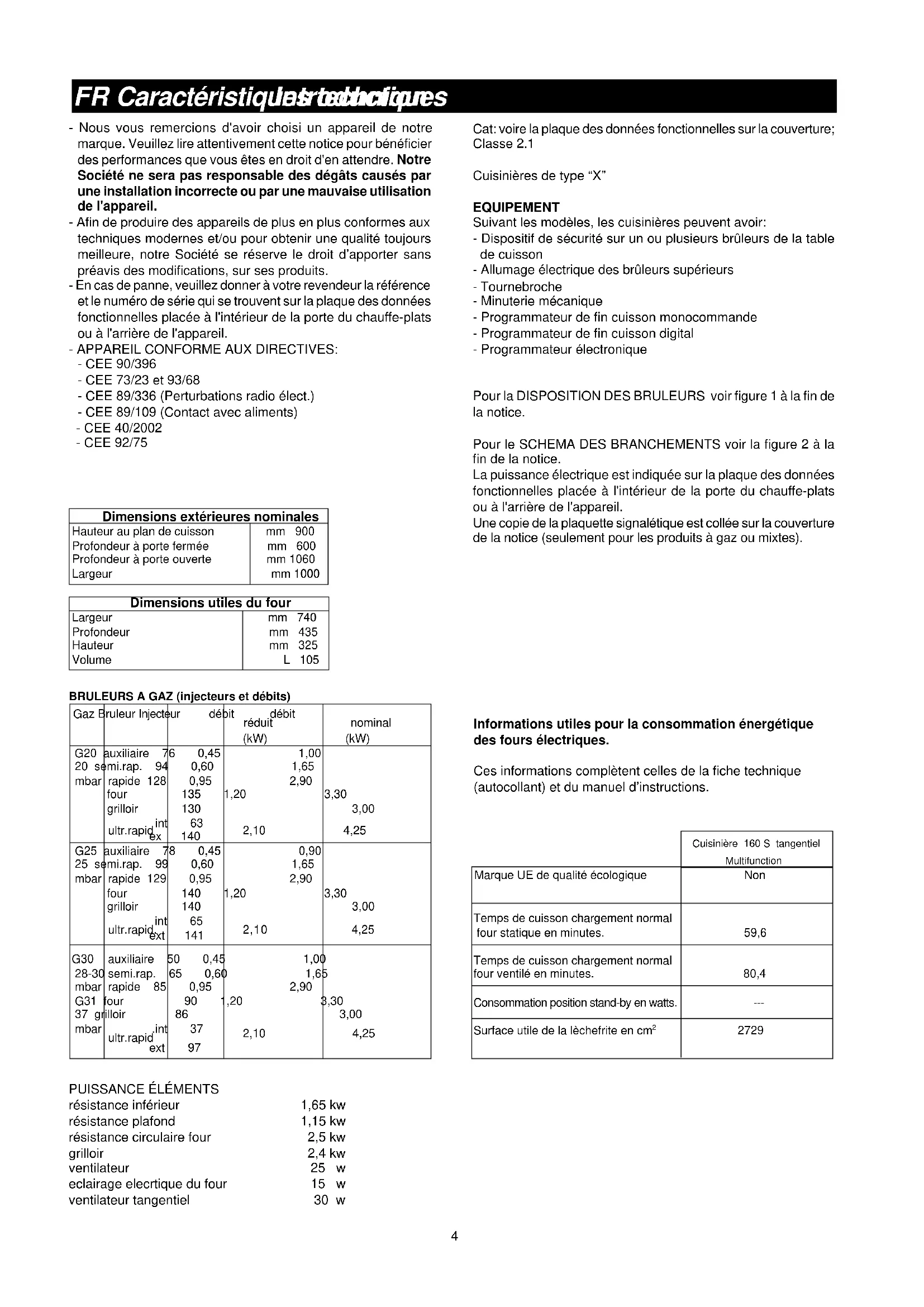 Figures / / Figures / Figure/ Figuren/Afbeeldingen .................................................... 39 - 404 - Nous vous remercions d'avoir choisi un appareil de notre marque. Veuillez lire attentivement cette notice pour bénéficier des performances que vous êtes en droit d'en attendre. Notre Société ne sera pas responsable des dégâts causés par une installation incorrecte ou par une mauvaise utilisation de l'appareil. - Afin de produire des appareils de plus en plus conformes aux techniques modernes et/ou pour obtenir une qualité toujours meilleure, notre Société se réserve le droit d’apporter sans préavis des modifications, sur ses produits. - En cas de panne, veuillez donner à votre revendeur la référence et le numéro de série qui se trouvent sur la plaque des données fonctionnelles placée à l'intérieur de la porte du chauffe-plats ou à l'arrière de l'appareil. - APPAREIL CONFORME AUX DIRECTIVES: - CEE 90/396 - CEE 73/23 et 93/68 - CEE 89/336 (Perturbations radio élect.) - CEE 89/109 (Contact avec aliments) - CEE 40/2002 - CEE 92/75 FR Caractéristiques techniques Cat: voire la plaque des données fonctionnelles sur la couverture; Classe 2.1 Cuisinières de type “X” EQUIPEMENT Suivant les modèles, les cuisinières peuvent avoir: - Dispositif de sécurité sur un ou plusieurs brûleurs de la table de cuisson - Allumage électrique des brûleurs supérieurs - Tournebroche - Minuterie mécanique - Programmateur de fin cuisson monocommande - Programmateur de fin cuisson digital - Programmateur électronique Pour la DISPOSITION DES BRULEURS voir figure 1 à la fin de la notice. Pour le SCHEMA DES BRANCHEMENTS voir la figure 2 à la fin de la notice. La puissance électrique est indiquée sur la plaque des données fonctionnelles placée à l'intérieur de la porte du chauffe-plats ou à l'arrière de l'appareil. Une copie de la plaquette signalétique est collée sur la couverture de la notice (seulement pour les produits à gaz ou mixtes). Introduction Dimensions extérieures nominales Hauteur au plan de cuisson mm 900 Profondeur à porte fermée mm 600 Profondeur à porte ouverte mm 1060 Largeur mm 1000 Dimensions utiles du four Largeur mm 740 Profondeur mm 435 Hauteur mm 325 Volume L 105 BRULEURS A GAZ (injecteurs et débits) Gaz Bruleur Injecteur débit débit réduit nominal (kW) (kW) G20 auxiliaire 76 0,45 1,00 20 semi.rap. 94 0,60 1,65 mbar rapide 128 0,95 2,90 four 135 1,20 3,30 grilloir 130 3,00 ultr.rapid int 63 2,10 4,25 ex 140 G25 auxiliaire 78 0,45 0,90 25 semi.rap. 99 0,60 1,65 mbar rapide 129 0,95 2,90 four 140 1,20 3,30 grilloir 140 3,00 ultr.rapid. int 65 2,10 4,25 ext 141 G30 auxiliaire 50 0,45 1,00 28-30 semi.rap. 65 0,60 1,65 mbar rapide 85 0,95 2,90 G31 four 90 1,20 3,30 37 grilloir 86 3,00 mbar ultr.rapid .int 37 2,10 4,25 ext 97