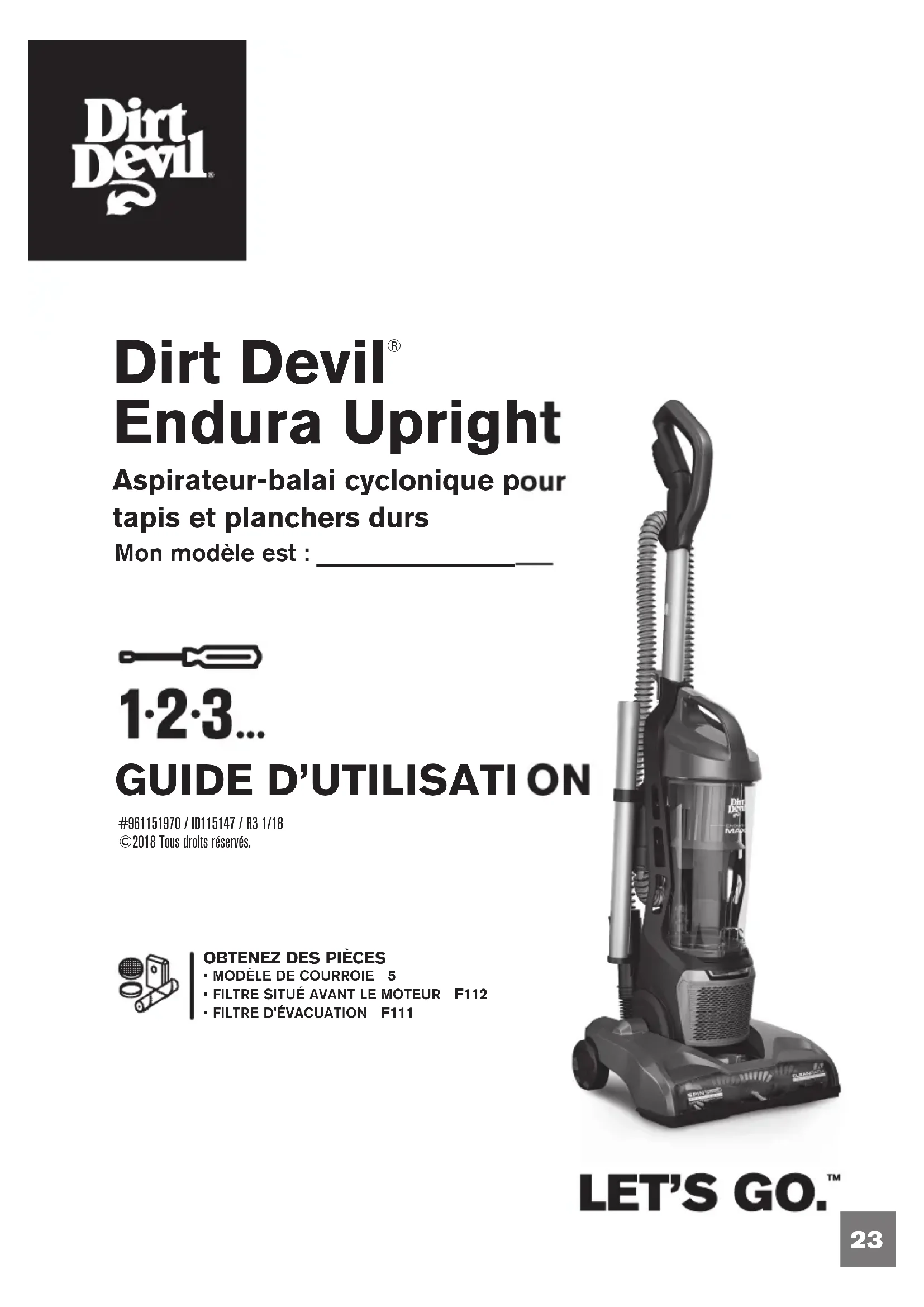 #961151970 / ID115147 / R3 1/18©2018 Tous droits réservés.OBTENEZ DES PIÈCES• MODÈLE DE COURROIE 5• FILTRE SITUÉ AVANT LE MOTEUR F112• FILTRE D’ÉVACUATION F111 Mon modèle est : ___________________24 BONJOUR! BIENVENUE ENREGISTREMENT DU PRODUIT Veuillez inscrire les renseignements de votre appareil ci-dessous afin de les consulter rapidement.No de modèle : Code du fabricant : (Vous trouverez le code du fabricant à l'arrière ou au bas de l'appareil) Enregistrement de la garantie Assurez-vous d'enregistrer votre produit en ligne sur le site www.dirtdevil.com ou en appelant au numéro 1 800 321-1134. Conseil : Brochez vos reçus d'achat à ce manuel du propriétaire La vérification de la date d'achat peut être requise pour une réparation au titre de la garantie de votre produit DirtDevil