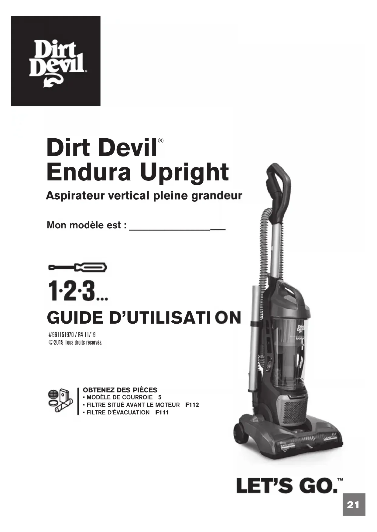 #961151970 / R4 11/19©2019 Tous droits réservés.OBTENEZ DES PIÈCES• MODÈLE DE COURROIE 5• FILTRE SITUÉ AVANT LE MOTEUR F112• FILTRE D’ÉVACUATION F111 Mon modèle est : ___________________22 BONJOUR! BIENVENUE ENREGISTREMENT DU PRODUIT Veuillez inscrire les renseignements de votre appareil ci-dessous afin de les consulter rapidement.No de modèle : Code du fabricant : (Vous trouverez le code du fabricant à l'arrière ou au bas de l'appareil) Enregistrement de la garantie Assurez-vous d'enregistrer votre produit en ligne sur le site www.dirtdevil.com ou en appelant au numéro 1 800 321-1134. Conseil : Brochez vos reçus d'achat à ce manuel du propriétaire La vérification de la date d'achat peut être requise pour une réparation au titre de la garantie de votre produit DirtDevil