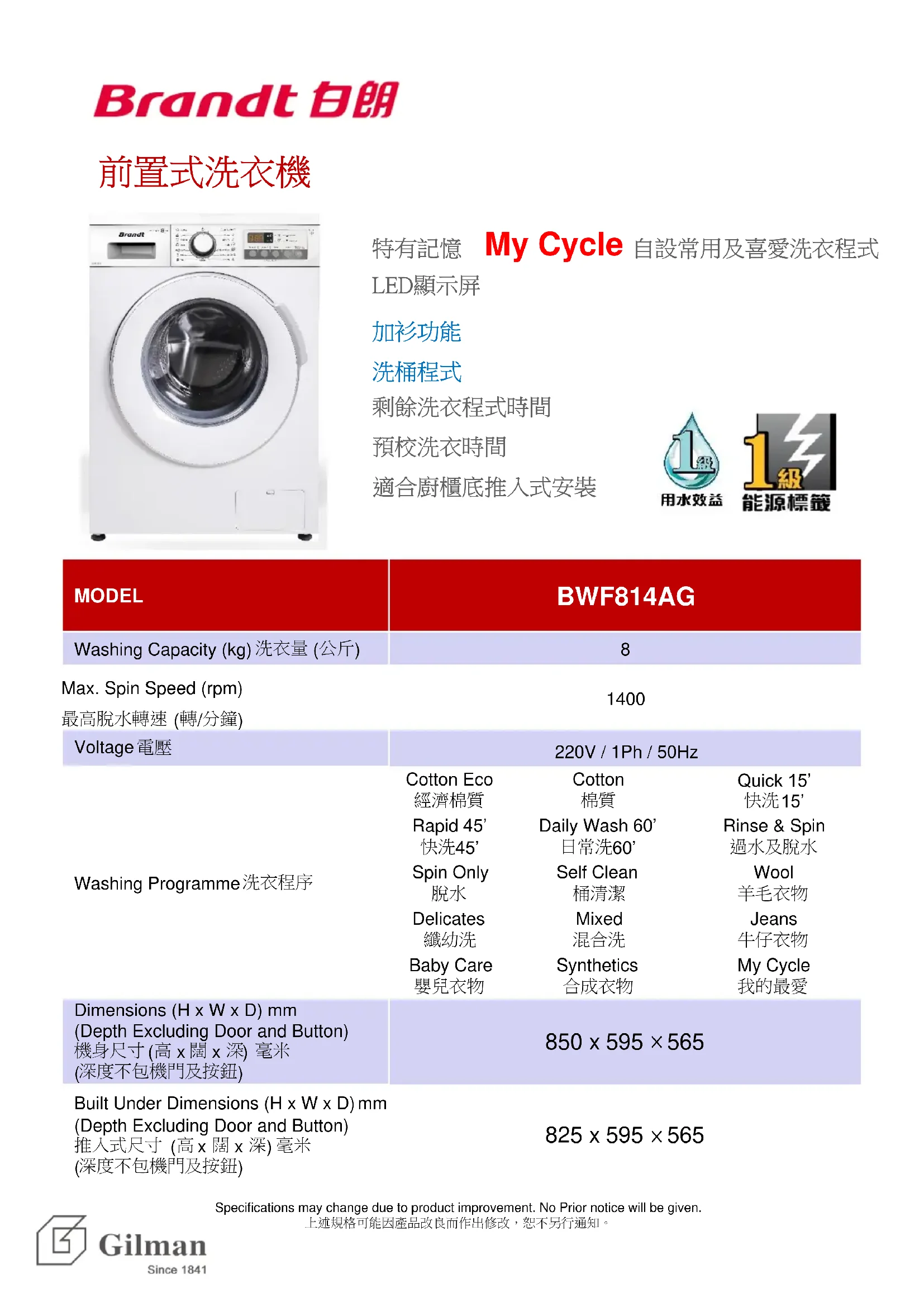 BWF814AG - Machine à laver BRANDT - Notice d'utilisation et mode d'emploi gratuit