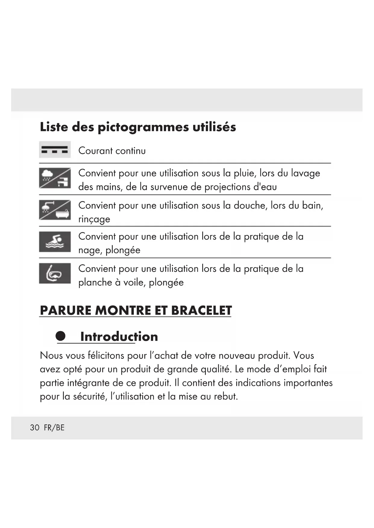 qui se trouve à l’intérieur (ill. F). Vous devez vous munir d’une pince pour retirer avec précaution l’ancienne goupille de la glissière (ill. G). Insérez la goupille de rechange délicatement dans la glissière en utilisant à nouveau une pince. L’installation de la nouvelle goupille est terminée. Nettoyage et entretien Nettoyez uniquement l’extérieur du produit avec un chiffon non pelucheux, propre et légèrement humidifié. Rincez si besoin le produit sous l’eau courante. Séchez-le bien après le rinçage.37 FR/BE Recyclage L’emballage se compose de matières recyclables pouvant être mises au rebut dans les déchetteries locales. Le «point vert» n‘est pas valable en Allemagne. Veuillez respecter l‘identification des matériaux d‘emballage pour le tri sélectif, ils sont identifiés avec des abbréviations (a) et des chiffres (b) ayant la signification suivante : 1–7 : plastiques / 20–22 : papiers et cartons / 80–98 : matériaux composite. Le produit et les matériaux d‘emballage sont recyclables, mettez-les au rebut séparément pour un meilleur traitement des déchets. Le logo Triman n‘est valable qu‘en France. Votre mairie ou votre municipalité vous renseigneront sur les possibilités de mise au rebut des produits usagés.38 FR/BE Afin de contribuer à la protection de l‘environnement, veuillez ne pas jeter votre produit usagé dans les ordures ménagères, mais éliminez-le de manière appropriée. Pour obtenir des renseignements concernant les points de collecte et leurs horaires d’ouverture, vous pouvez contacter votre municipalité. Les piles / piles rechargeables défectueuses ou usagées doivent être recyclées conformément à la directive 2006/66/CE et ses modifications. Veuillez ramener les piles / piles rechargeables et / ou le produit aux points de collecte disponibles. Pollution de l’environnement résultant de la mise au rebut incorrecte des piles / piles rechargeables ! Les piles / piles rechargeables ne doivent pas être mises au rebut avec les ordures ménagères. Elles peuvent contenir des métaux lourds toxiques et doivent être considérés comme des déchets spéciaux. Les symboles chimiques des métaux lourds sont les suivants : Cd = cadmium, Hg = mercure, Pb = plomb. Pour cette raison, veuillez toujours mettre au rebut les piles / piles rechargeables usagées dans les points de collecte de votre localité.39 FR/BE Garantie Le produit a été fabriqué selon des critères de qualité stricts et contrôlé consciencieusement avant sa livraison. En cas de défaillance, vous êtes en droit de retourner ce produit au vendeur. La présente garantie ne constitue pas une restriction de vos droits légaux. Ce produit bénéficie d‘une garantie de 3 ans à compter de sa date d’achat. La durée de garantie débute à la date d’achat. Veuillez conserver le ticket de caisse original. Il fera office de preuve d’achat. Si un problème matériel ou de fabrication devait survenir dans 3 ans suivant la date d‘achat de ce produit, nous assurons à notre discrétion la réparation ou le remplacement du produit sans frais supplémentaires. La garantie prend fin si le produit est endommagé suite à une utilisation inappropriée ou à un entretien défaillant.40 FR/BE La garantie couvre les vices matériels et de fabrication. Cette garantie ne s’étend ni aux pièces du produit soumises à une usure normale (p. ex. des piles) et qui, par conséquent, peuvent être considérées comme des pièces d’usure, ni aux dommages sur des composants fragiles, comme des interrupteurs, des batteries ou des éléments fabriqués en verre. La garantie ne couvre pas non plus la perte de l‘étanchéité à l‘eau. L‘état d‘étanchéité à l‘eau n‘est pas une propriété durable et fait l‘objet d‘une maintenance périodique. Veuillez noter que votre garantie devient caduque pour les cas suivants: ouverture et la réparation de votre montre par des personnes non autorisées.41 NL/BE Overzicht van gebruikte pictogrammen .......Pagina 42 Inleiding .....................................Pagina 42 Doelmatig gebruik . . . . . . . . . . . . . . . . . . . . . . . . . . . . Pagina 43 Onderdelen ..................................Pagina 43 Technische gegevens..........................Pagina 44 Leveringsomvang.............................Pagina 44 Ingebruikname ...............................Pagina 45 De batterij vervangen..........................Pagina 45 Tijd instellen ..................................Pagina 45 Waterdichtheid...............................Pagina 46 Horlogeband inkorten ........................Pagina 46 Modelnr. HG03031A / HG03031C .............Pagina 46 Modelnr. HG03031E .........................Pagina 46 Segmenten verwijderen (afb. D) .................Pagina 47 De stift in de schuiver vervangen (afb. E, F, G) ......Pagina 48 Reiniging en onderhoud ......................Pagina 48 Verwijdering . . . . . . . . . . . . . . . . . . . . . . . . . . . . . . . . . Pagina 49 Garantie .....................................Pagina 5142 NL/BE Overzicht van gebruikte pictogrammen Gelijkstroom Geschikt voor gebruik bij regen, handenwassen, opspattend water Geschikt voor gebruik bij douchen, de afwas doen, baden Geschikt voor gebruik bij zwemmen, snorkelen Geschikt voor gebruik bij het windsurfen, duiken POLSHORLOGE-SIERADENSET Inleiding Hartelijk gefeliciteerd met de aankoop van uw nieuwe product. U heeft voor een hoogwaardig product gekozen. De gebruiksaanwijzing is een deel van het product. Deze bevat belangrijke aanwijzingen voor veiligheid, gebruik en verwijdering. Maakt U zich voor de ingebruikname van het product met alle bedienings- en veiligheidsvoorschriften vertrouwd.43 NL/BE Gebruik het apparaat alleen zoals beschreven en voor de aangegeven toepassingsgebieden. Overhandig alle documenten bij doorgifte van het product aan derden. Doelmatig gebruik Het product is bestemd voor privégebruik en mag niet gebruikt worden 