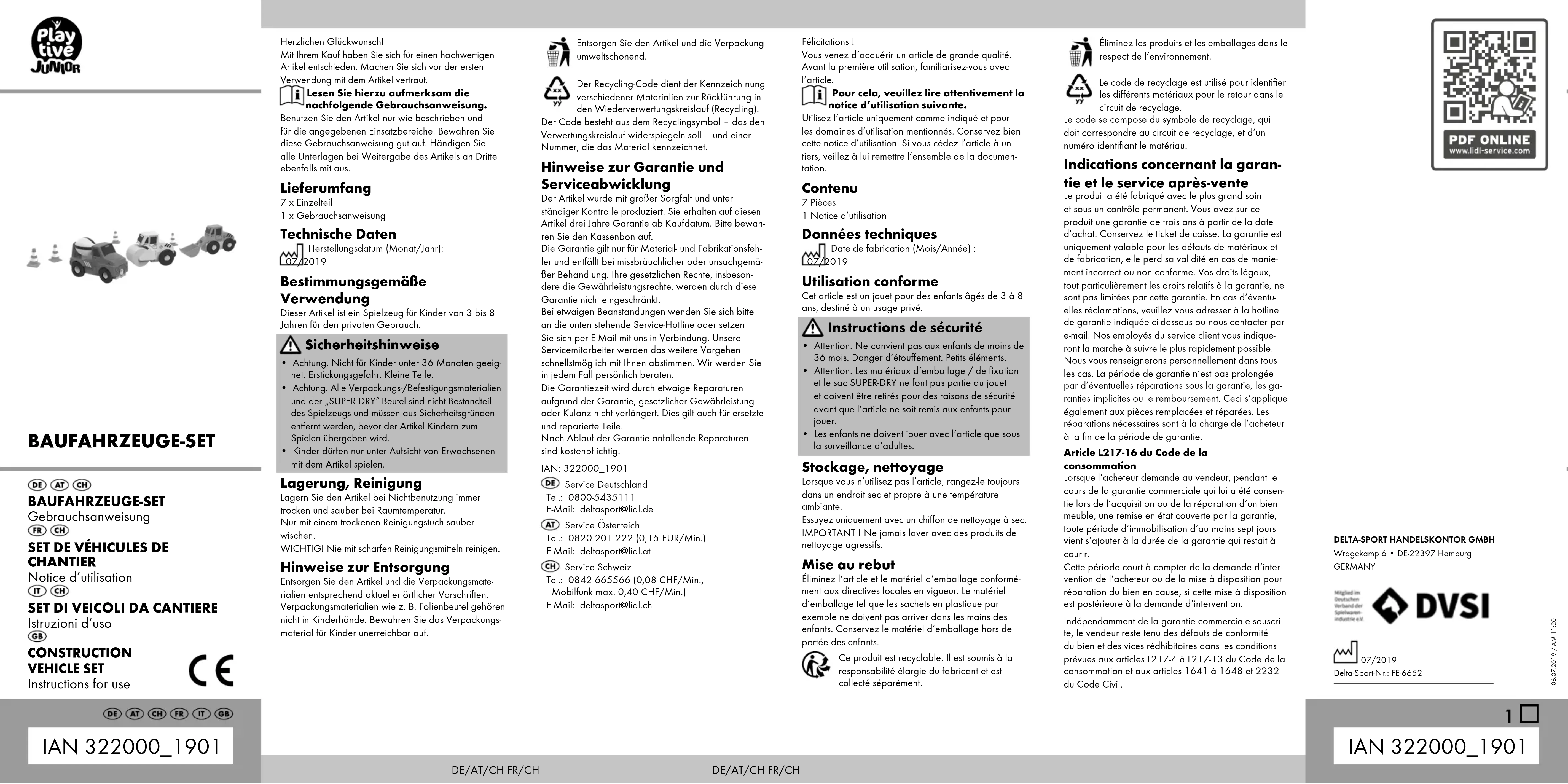 - s‘il présente les qualités qu‘un acheteur peut légitimement attendre eu égard aux déclarations pu- bliques faites par le vendeur, par le producteur ou par son représentant, notamment dans la publicité ou l‘étiquetage ; 2° Ou s‘il présente les caractéristiques définies d‘un commun accord par les parties ou être propre à tout usage spécial recherché par l‘acheteur, porté à la connaissance du vendeur et que ce dernier a accepté. Article L217-12 du Code de la consommation L‘action résultant du défaut de conformité se prescrit par deux ans à compter de la délivrance du bien. Article 1641 du Code civil Le vendeur est tenu de la garantie à raison des défauts cachés de la chose vendue qui la rendent impropre à l‘usage auquel on la destine, ou qui di- minuent tellement cet usage que l‘acheteur ne l‘aurait pas acquise, ou n‘en aurait donné qu‘un moindre prix, s‘il les avait connus. Article 1648 1er alinéa du Code civil L‘action résultant des vices rédhibitoires doit être intentée par l‘acquéreur dans un délai de deux ans à compter de la découverte du vice. Les pièces détachées indispensables à l’utilisation du produit sont disponibles pendant la durée de la garantie du produit. IAN : 322000_1901 Service Suisse Tel. : 0842 665566 (0,08 CHF/Min., mobile max. 0,40 CHF/Min.) E-Mail : deltasport@lidl.ch Congratulazioni! Avete acquistato un articolo di alta qualità. Consiglia- mo di familiarizzare con l’articolo prima di cominciare ad utilizzarlo. Leggere attentamente le seguenti istruzioni d’uso. Utilizzare l’articolo solo nel modo descritto e per gli ambiti di applicazione indicati. Conservare accurata- mente queste istruzioni d’uso. In caso di trasferimento dell’articolo a terzi, consegnare tutti i documenti insieme all’articolo. Contenuto della confezione 7 x Pezzi 1 x Istruzioni d‘uso Dati tecnici Data di produzione (mese/anno): 07/2019 Utilizzo conforme Questo giocattolo è adatto ai bambini dai 3 ai 8 anni ed è destinato all’uso privato. Avvertenze di sicurezza
