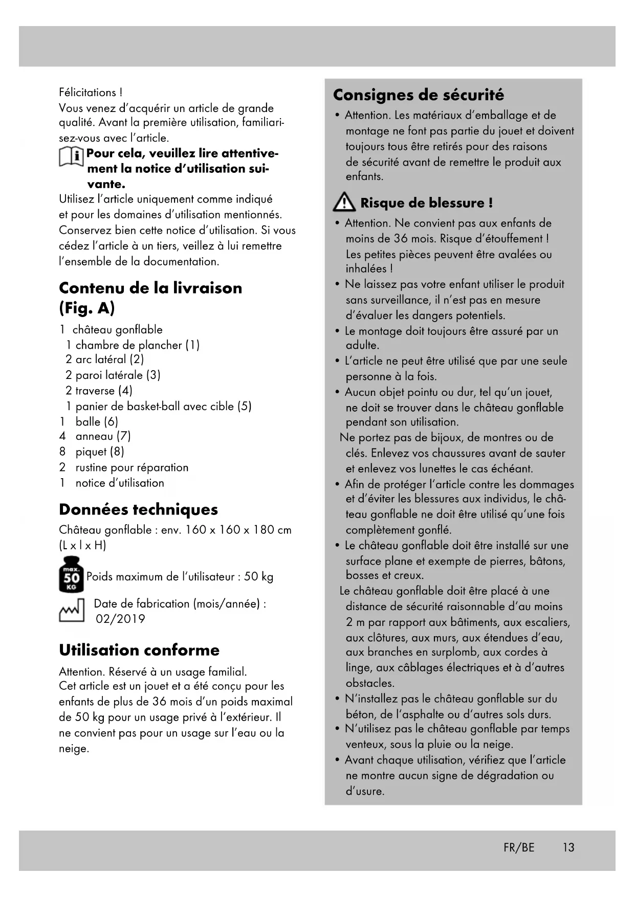 - Afin de protéger l‘article contre les dommages et d’éviter les blessures aux individus, le châ- teau gonflable ne doit être utilisé qu‘une fois complètement gonflé.