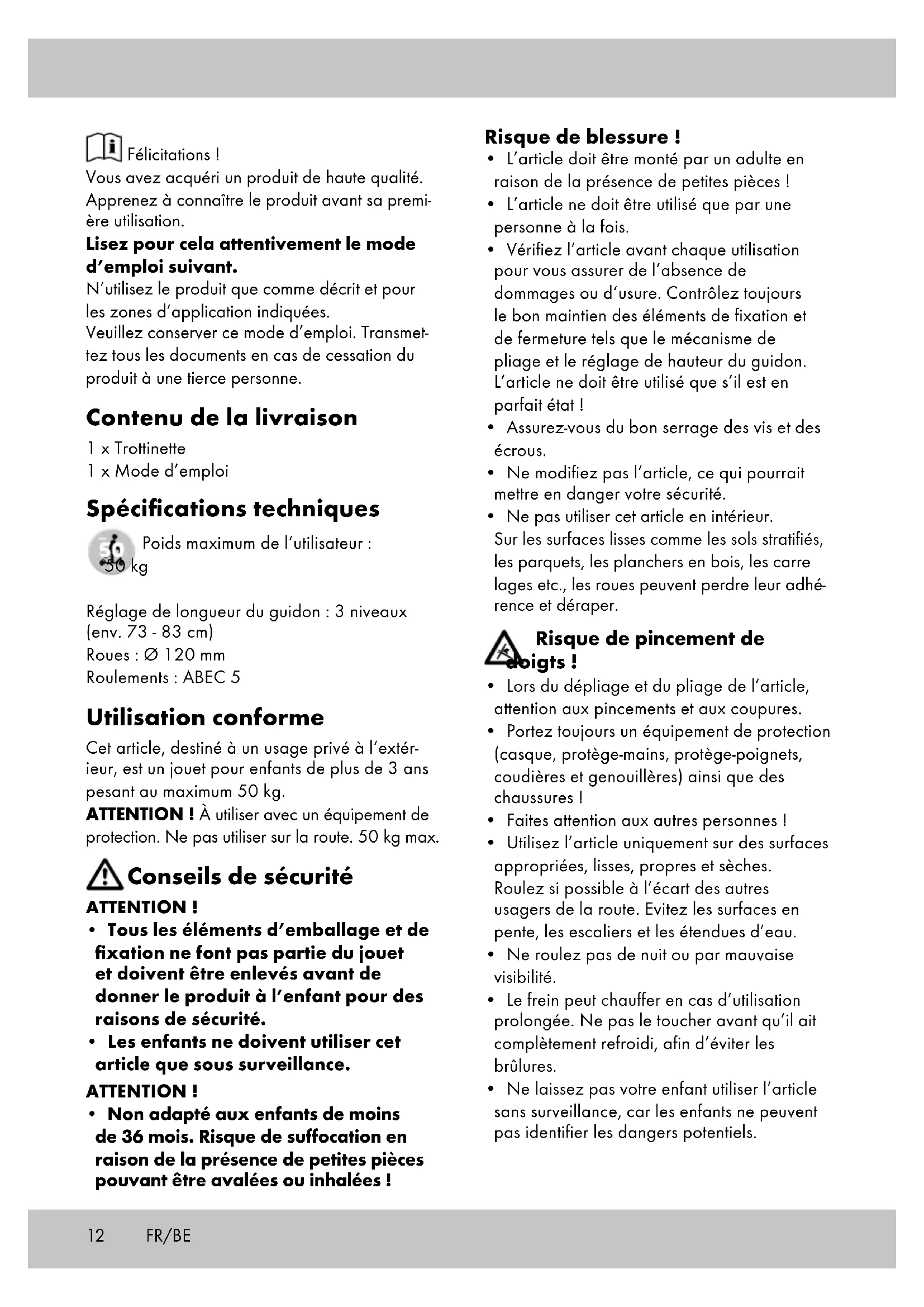 - Fasten the wheels again. Maintenance, storage We recommend to clean and dry the article thoroughly after use. Remove little stones or other objects that possibly have become stuck on your wheels. Dry wet or damp ball bearings with a clean cloth. Grease the bearings from the outside with a suitable bearing grease, to prevent rusting on the outside. Store the article in a dry place. Disposal Dispose of the article and the packaging materials in accordance with current local regulations. Packaging materials such as foil bags are not suitable to be given to children. Keep the packaging materials out of the reach of children.12 Félicitations ! Vous avez acquéri un produit de haute qualité. Apprenez à connaître le produit avant sa premi- ère utilisation. Lisez pour cela attentivement le mode d’emploi suivant. N’utilisez le produit que comme décrit et pour les zones d’application indiquées. Veuillez conserver ce mode d’emploi. Transmet- tez tous les documents en cas de cessation du produit à une tierce personne. Contenu de la livraison 1 x Trottinette 1 x Mode d’emploi Spécifications techniques Poids maximum de l‘utilisateur : 50 kg Réglage de longueur du guidon : 3 niveaux (env. 73 - 83 cm) Roues : Ø 120 mm Roulements : ABEC 5 Utilisation conforme Cet article, destiné à un usage privé à l‘extér- ieur, est un jouet pour enfants de plus de 3 ans pesant au maximum 50 kg. ATTENTION ! À utiliser avec un équipement de protection. Ne pas utiliser sur la route. 50 kg max. Conseils de sécurité ATTENTION !