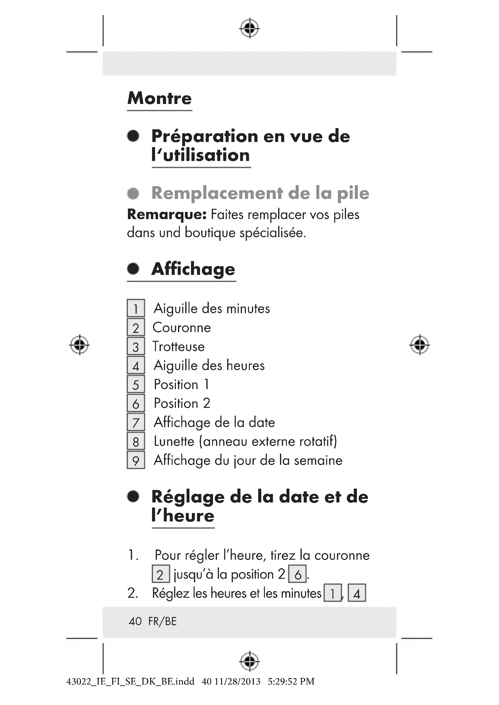 dans le sens contraire des aiguilles d‘une montre pour marquer le début d‘une mesure 43022_IE_FI_SE_DK_BE.indd 43 11/28/2013 5:29:52 PM44 FR/BE de temps.