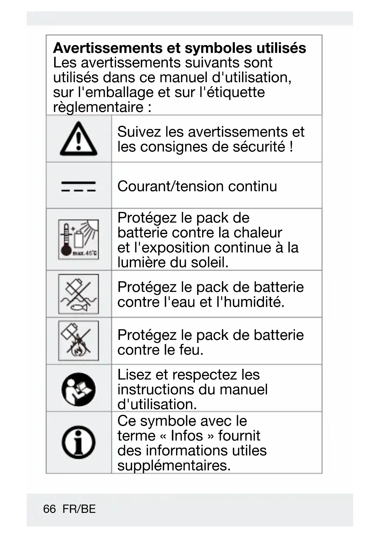 RÉFÉRENCE FUTURE. a) Rechargez uniquement avec le chargeur spécié par le fabricant. Un chargeur qui convient à un type de batterie rechargeable peut générer un risque d’incendie quand il est utilisé avec une autre batterie rechargeable.74 FR/BE b) Utilisez des outils électriques uniquement avec des batteries rechargeables spéciquement désignées. L'utilisation de tout autre type de batterie rechargeable peut causer un risque de blessure et d'incendie. c) Lorsque la batterie rechargeable n'est pas utilisée, maintenez-la à l'écart d'autres objets métalliques, tels que les trombones, les pièces, les clés, les clous, les vis ou les autres petits objets métalliques pouvant réaliser une connexion d'une borne à une autre. Court-circuiter les bornes de la batterie entre elles peut causer des brûlures ou un incendie.75 FR/BE d) Dans des conditions abusives, du liquide peut être éjecté de la batterierechargeable ; évitez tout contact. Si un contact se produit accidentellement, rincez la zone aectée avec de l'eau. Si le liquide entre en contact avec les yeux, consultez également un médecin. Le liquide éjecté de la batterie peut causer une irritation ou des brûlures.