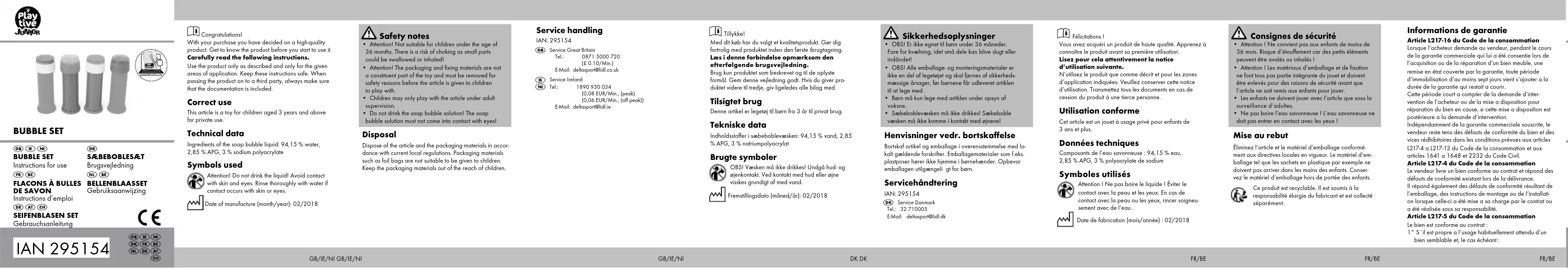 IAN 295154 BUBBLE SET Instructions for use BUBBLE SET Félicitations ! Vous avez acquéri un produit de haute qualité. Apprenez à connaître le produit avant sa première utilisation. Lisez pour cela attentivement la notice d’utilisation suivante. N’utilisez le produit que comme décrit et pour les zones d’application indiquées. Veuillez conserver cette notice d’utilisation. Transmettez tous les documents en cas de cession du produit à une tierce personne. Utilisation conforme Cet article est un jouet à usage privé pour enfants de 3 ans et plus. Données techniques Composants de l‘eau savonneuse : 94,15 % eau, 2,85 % APG, 3 % polyacrylate de sodium Symboles utilisés Attention ! Ne pas boire le liquide ! Éviter le contact avec la peau et les yeux. En cas de contact avec la peau ou les yeux, rincer soigneu-sement avec de l‘eau. Date de fabrication (mois/année) : 02/2018FR/BE