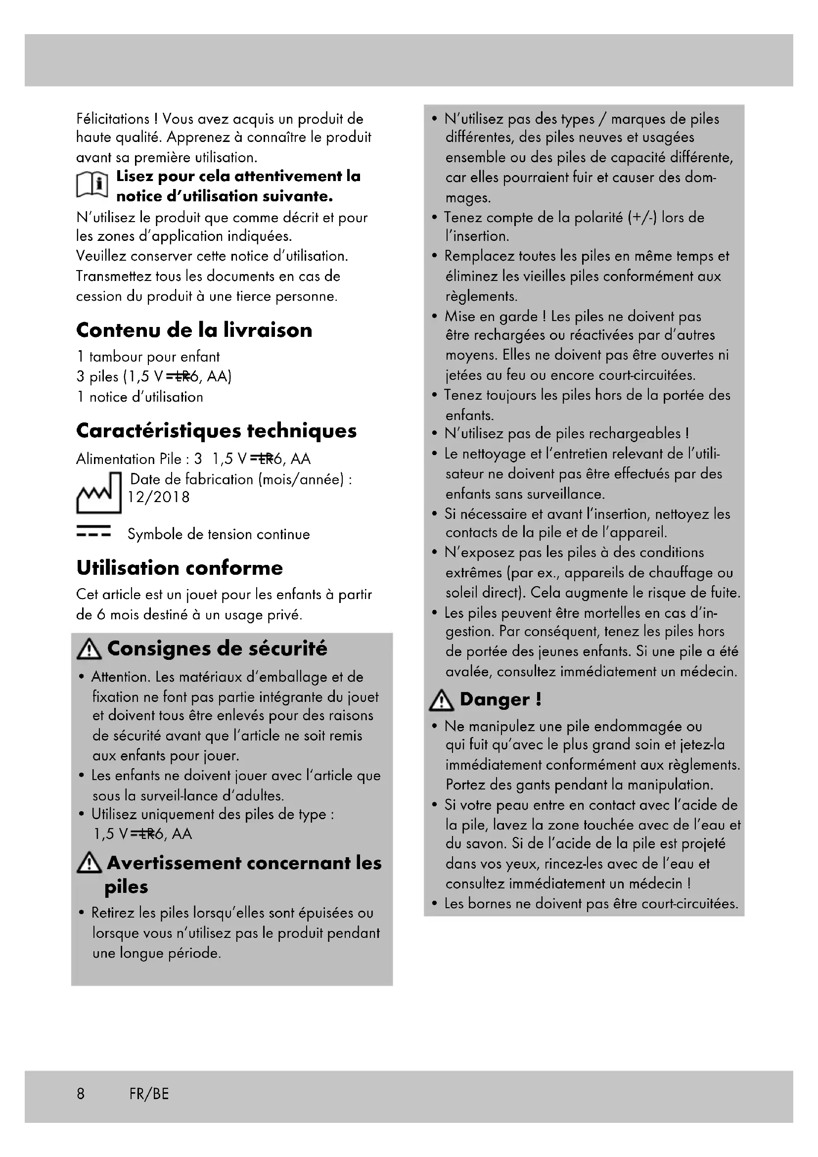 - s‘il présente les qualités qu‘un acheteur peut légitimement attendre eu égard aux déclara- tions publiques faites par le vendeur, par le producteur ou par son représentant, notam- ment dans la publicité ou l‘étiquetage ; 2° Ou s‘il présente les caractéristiques définies d‘un commun accord par les parties ou être propre à tout usage spécial recherché par l‘acheteur, porté à la connaissance du vendeur et que ce dernier a accepté. Article L217-12 du Code de la consommation L‘action résultant du défaut de conformité se prescrit par deux ans à compter de la délivrance du bien. Article 1641 du Code civil Le vendeur est tenu de la garantie à raison des défauts cachés de la chose vendue qui la ren- dent impropre à l‘usage auquel on la destine, ou qui diminuent tellement cet usage que l‘acheteur ne l‘aurait pas acquise, ou n‘en aurait donné qu‘un moindre prix, s‘il les avait connus. Article 1648 1er alinéa du Code civil L‘action résultant des vices rédhibitoires doit être intentée par l‘acquéreur dans un délai de deux ans à compter de la découverte du vice. Les pièces détachées indispensables à l’utilisation du produit sont disponibles pendant la durée de la garantie du produit. IAN : 309549 Service Belgique Tel. : 070 270 171 (0,15 EUR/Min.) E-Mail : deltasport@lidl.be11 Hartelijk gefeliciteerd! Met de aankoop hebt u gekozen voor een hoogwaardig product. Maak u daarom voor de eerste ingebruikname vertrouwd met het product. Lees hiervoor deze gebruiks- aanwijzing aandachtig door. Gebruik het product alleen zoals beschreven en uitsluitend voor de aangegeven doeleinden. Bewaar de gebruiksaanwijzing zorgvuldig. Als u het product aan derden geeft, dient u ook deze documenten te overhandigen. In het leveringspakket inbegrepen 1 x kindertrommel 3 x batterij (1,5V LR6, AA) 1 x gebruiksaanwijzing Technische gegevens Energievoorziening batterij: 3 x 1,5V LR6, AA Productiedatum (maand/jaar): 12/2018 Symbool voor gelijkspanning Voorgeschreven gebruik Dit artikel is als speelgoed voor kinderen met een leeftijd vanaf ½ jaar voor privégebruik bestemd. Veiligheidsinstructies