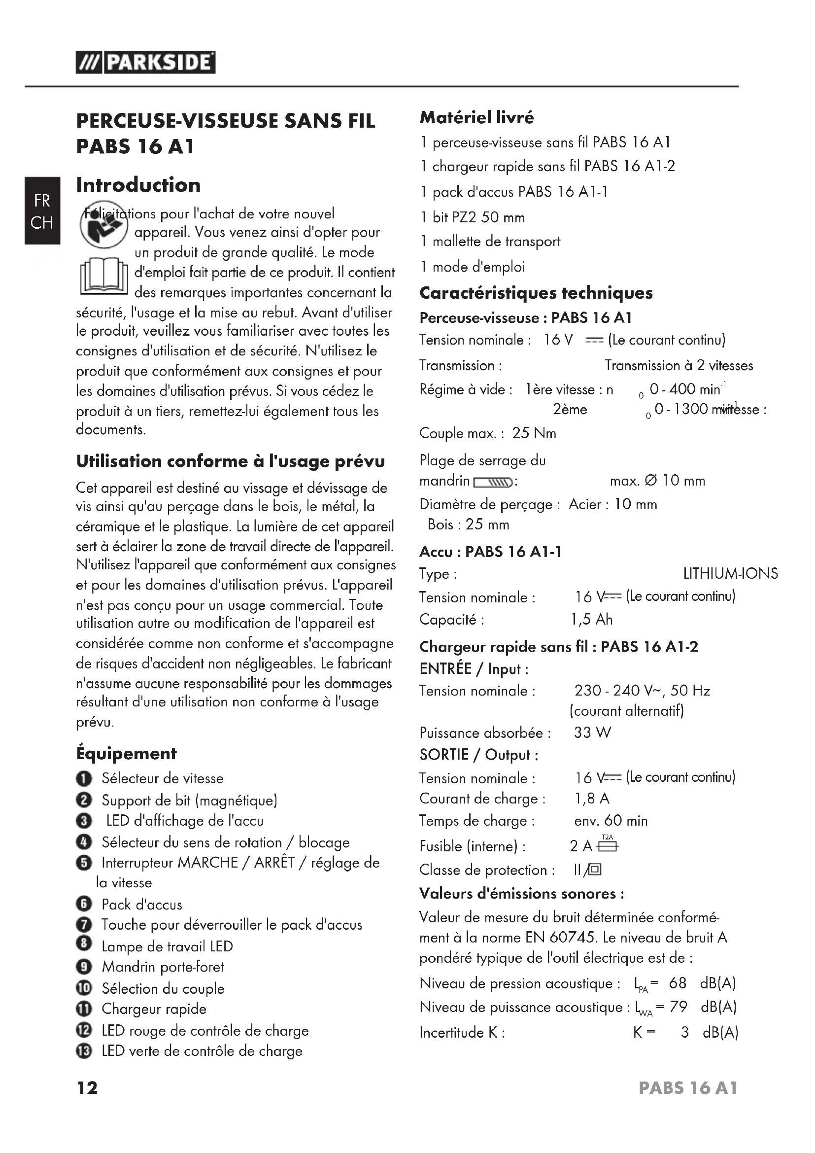 PABS 16 A1 Introduction Félicitations pour l'achat de votre nouvel appareil. Vous venez ainsi d'opter pour un produit de grande qualité. Le mode d'emploi fait partie de ce produit. Il contient des remarques importantes concernant la sécurité, l'usage et la mise au rebut. Avant d'utiliser le produit, veuillez vous familiariser avec toutes les consignes d'utilisation et de sécurité. N'utilisez le produit que conformément aux consignes et pour les domaines d'utilisation prévus. Si vous cédez le produit à un tiers, remettez-lui également tous les documents. Utilisation conforme à l'usage prévu Cet appareil est destiné au vissage et dévissage de vis ainsi qu'au perçage dans le bois, le métal, la céramique et le plastique. La lumière de cet appareil sert à éclairer la zone de travail directe de l'appareil. N'utilisez l'appareil que conformément aux consignes et pour les domaines d'utilisation prévus. L'appareil n'est pas conçu pour un usage commercial. Toute utilisation autre ou modification de l'appareil est considérée comme non conforme et s'accompagne de risques d'accident non négligeables. Le fabricant n'assume aucune responsabilité pour les dommages résultant d'une utilisation non conforme à l'usage prévu. Équipement Sélecteur de vitesse Support de bit (magnétique) LED d'affichage de l'accu Sélecteur du sens de rotation / blocage Interrupteur MARCHE / ARRÊT / réglage de la vitesse Pack d'accus Touche pour déverrouiller le pack d'accus Lampe de travail LED Mandrin porte-foret Sélection du couple Chargeur rapide LED rouge de contrôle de charge LED verte de contrôle de charge Matériel livré 1 perceuse-visseuse sans fil PABS 16 A1 1 chargeur rapide sans fil PABS 16 A1-2 1 pack d'accus PABS 16 A1-1 1 bit PZ2 50 mm 1 mallette de transport 1 mode d'emploi Caractéristiques techniques Perceuse-visseuse: PABS 16 A1 Tension nominale: 16 V (Le courant continu) Transmission: Transmission à 2 vitesses Régime à vide: 1ère vitesse: n